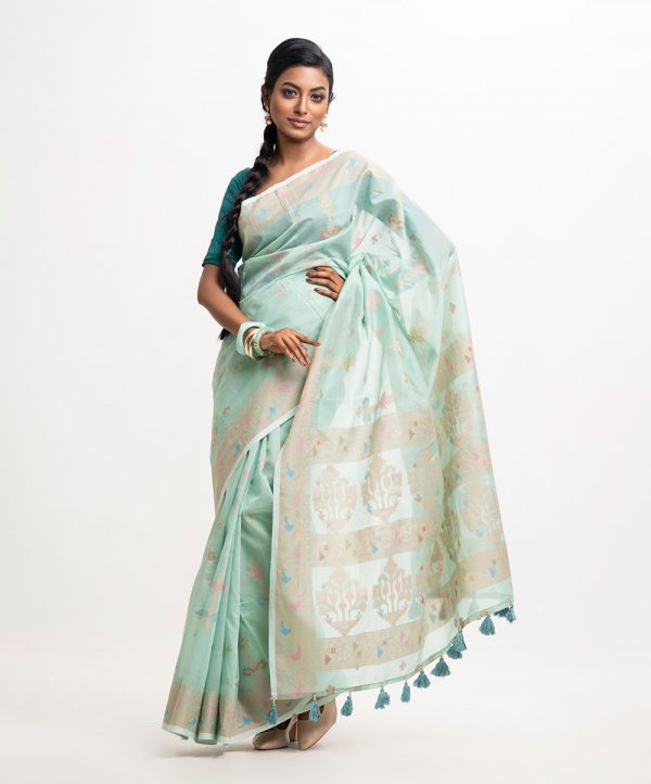 All-over Jamdani pattern weaving details saree in half-silk fabric. Tassels at the Aanchal.