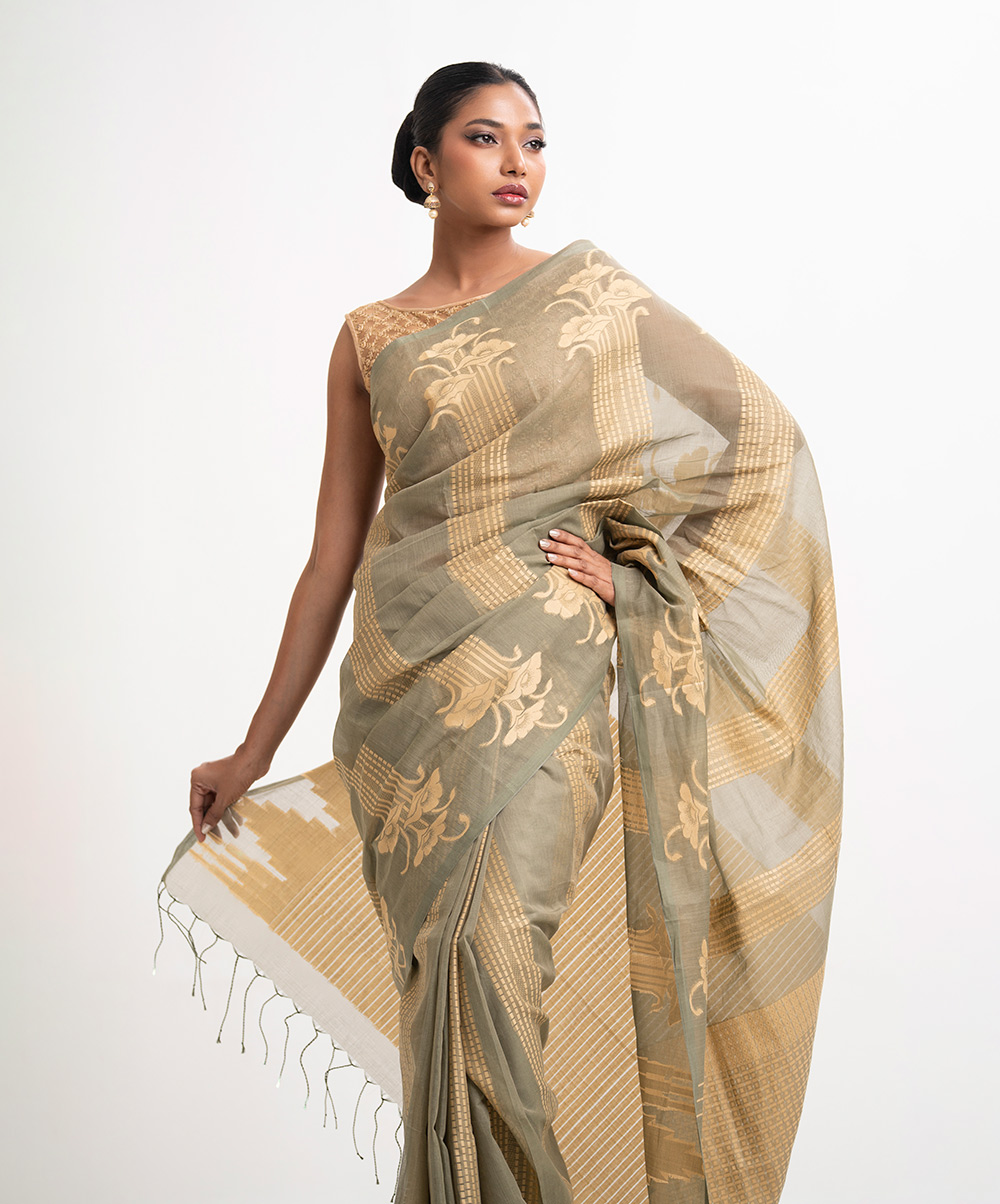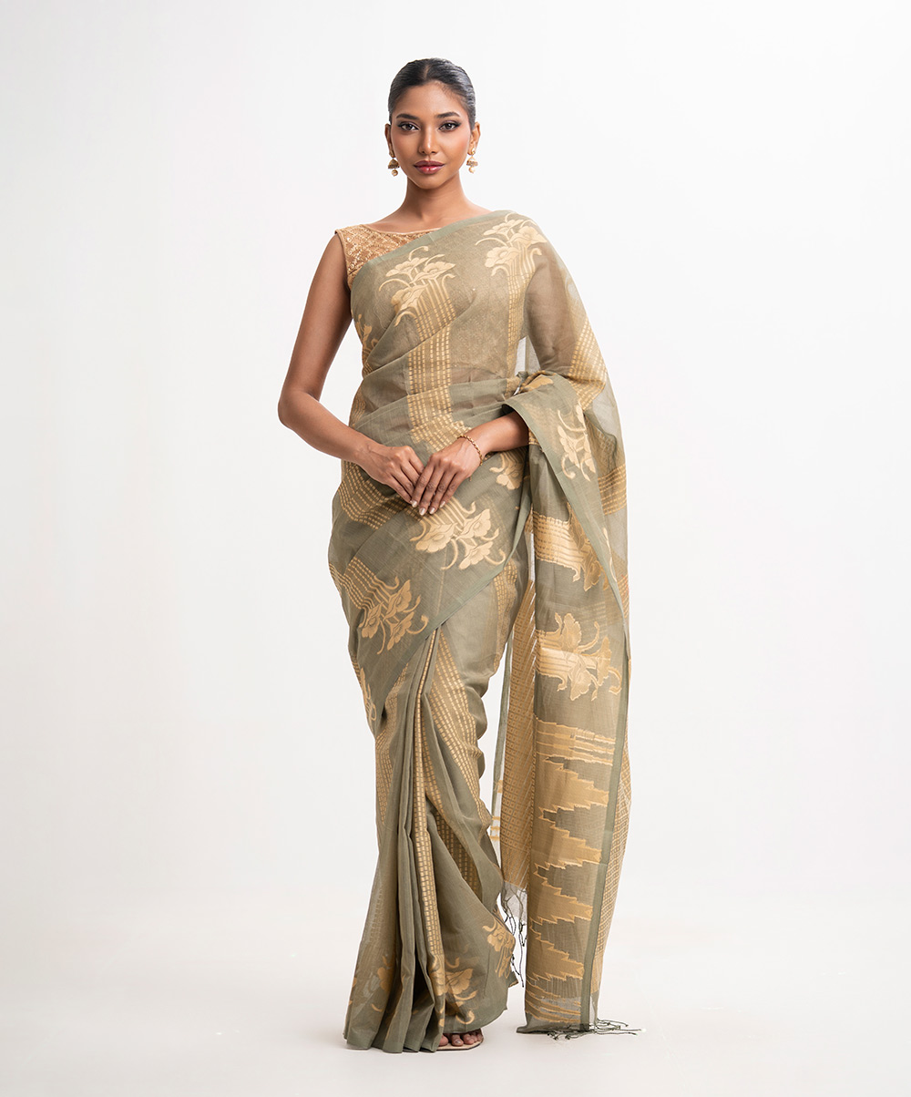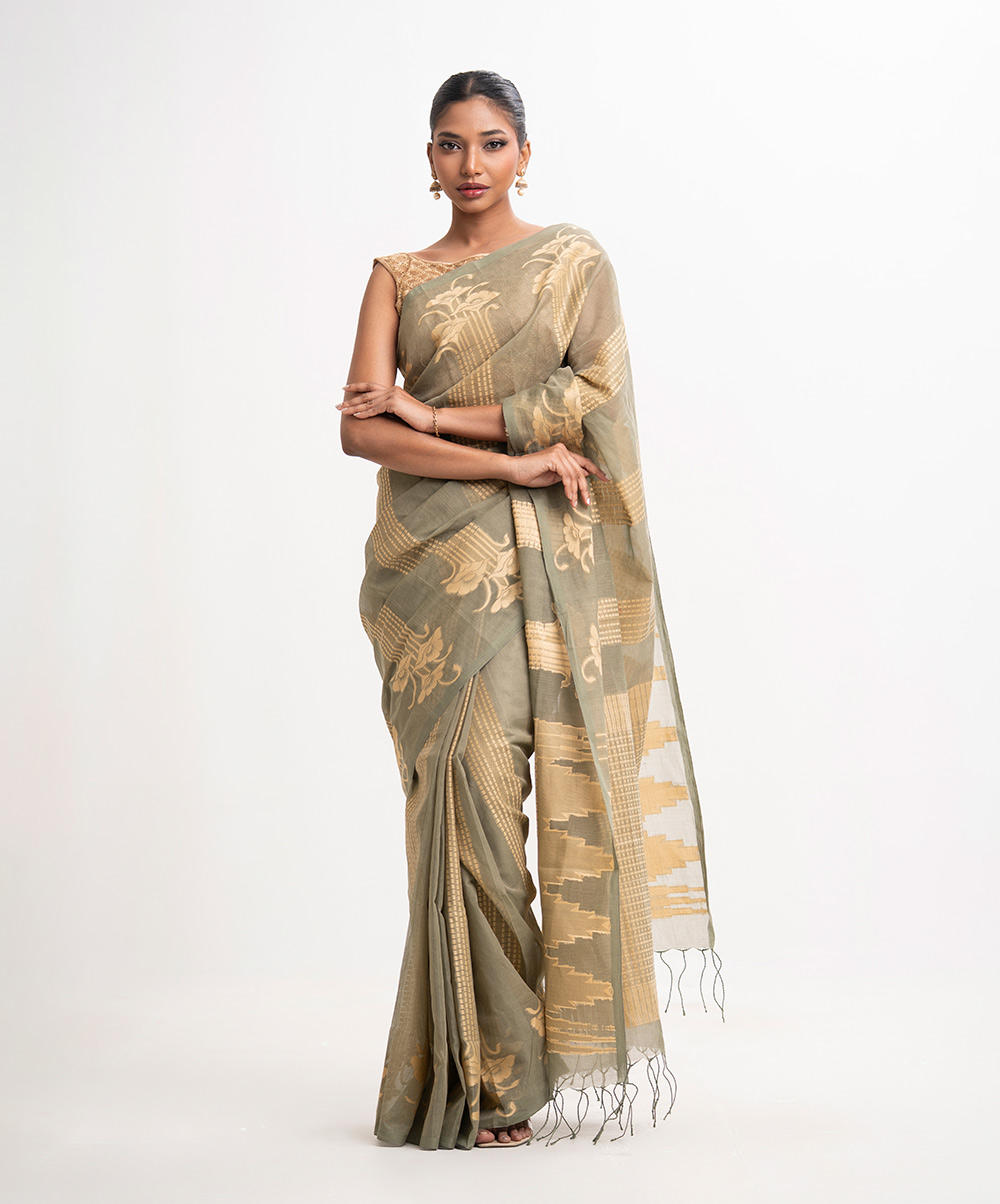 All-over weaving details saree in cotton fabric. Fringe trim at the Aanchal.