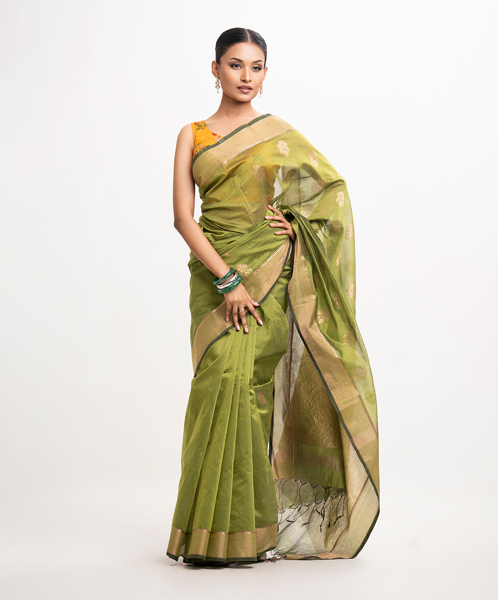 All-over weaving details saree in half-silk fabric. Zari threads & fringe trim at the Aanchal.