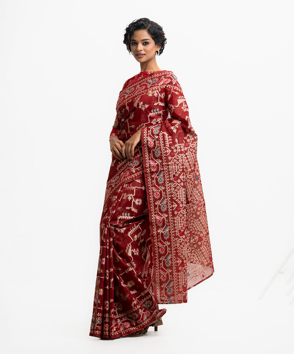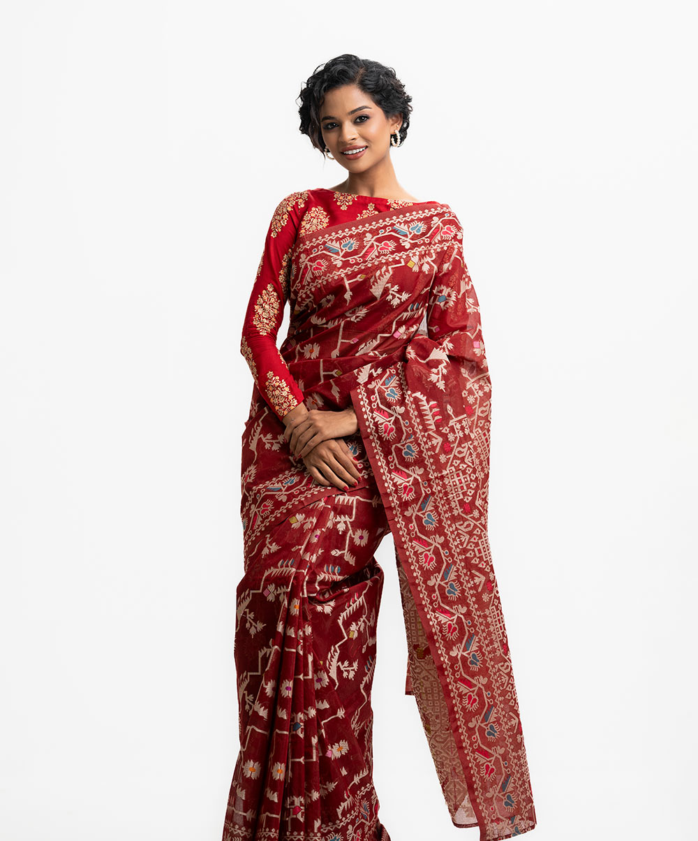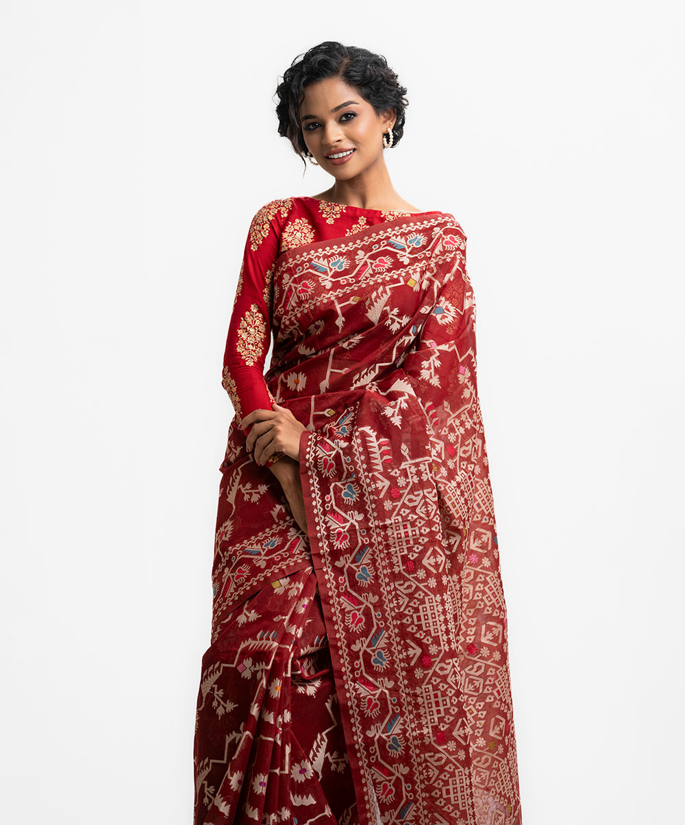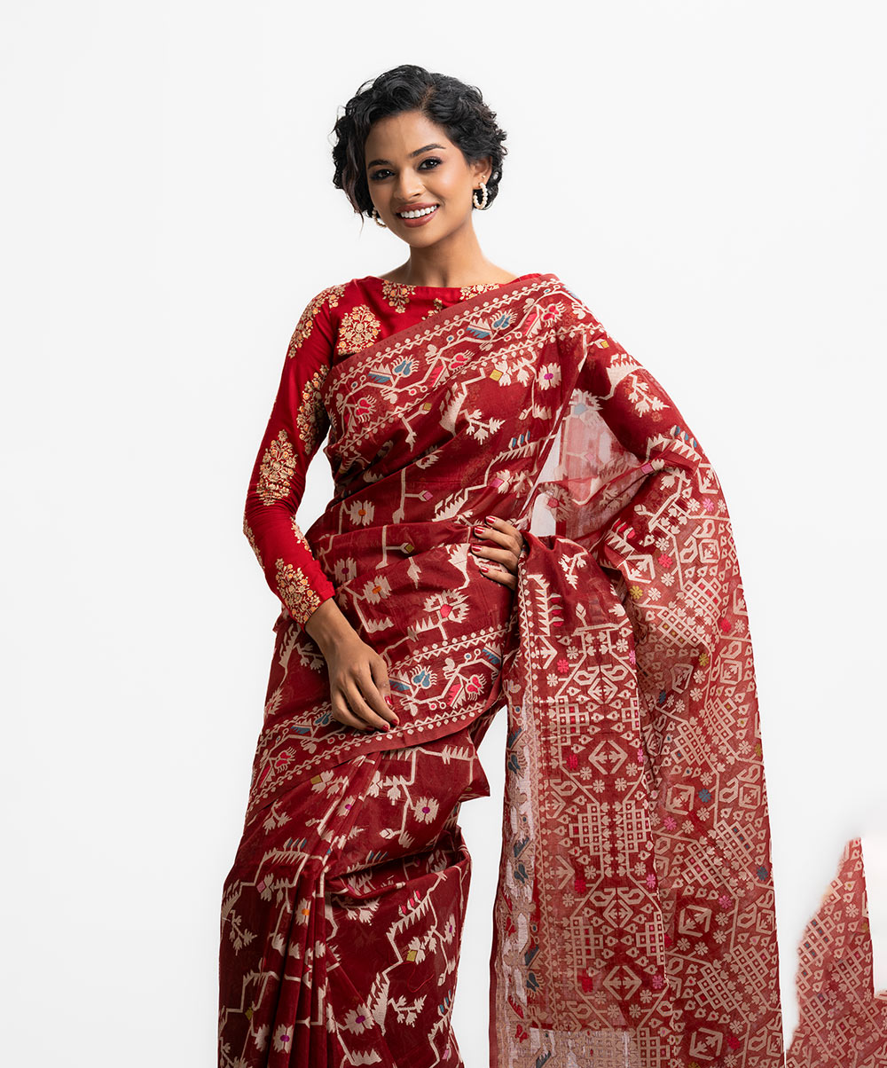 All-over jamdani pattern weaving details saree in half-silk fabric. Colorful threads detail at Aanchal.