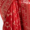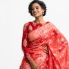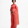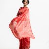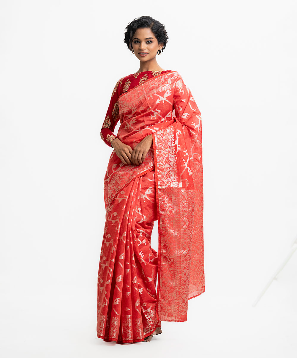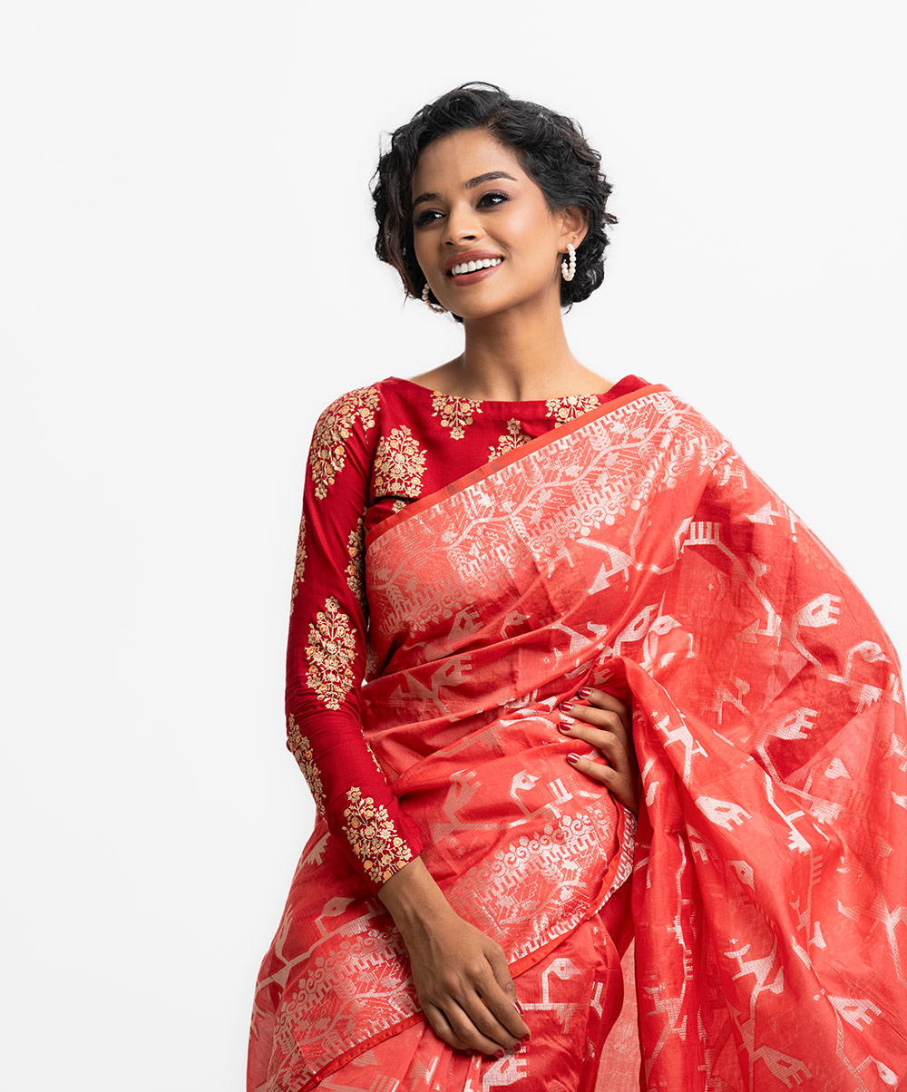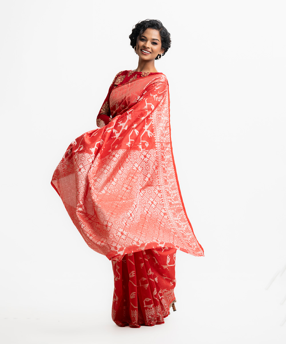 All-over jamdani pattern weaving details saree in half-silk fabric. Zari threads detail at Aanchal.