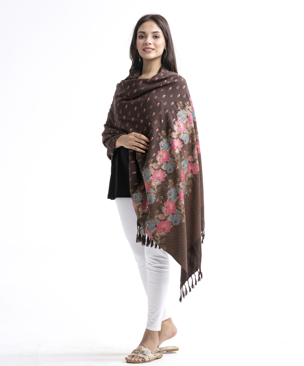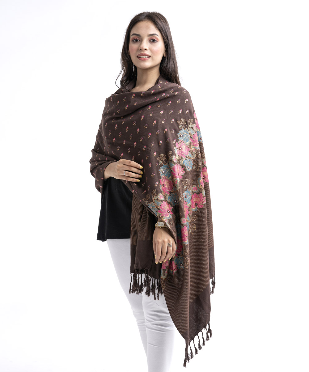 All-over printed Coffee shawl in Viscose fabric & embellished faux mirror embroidery.