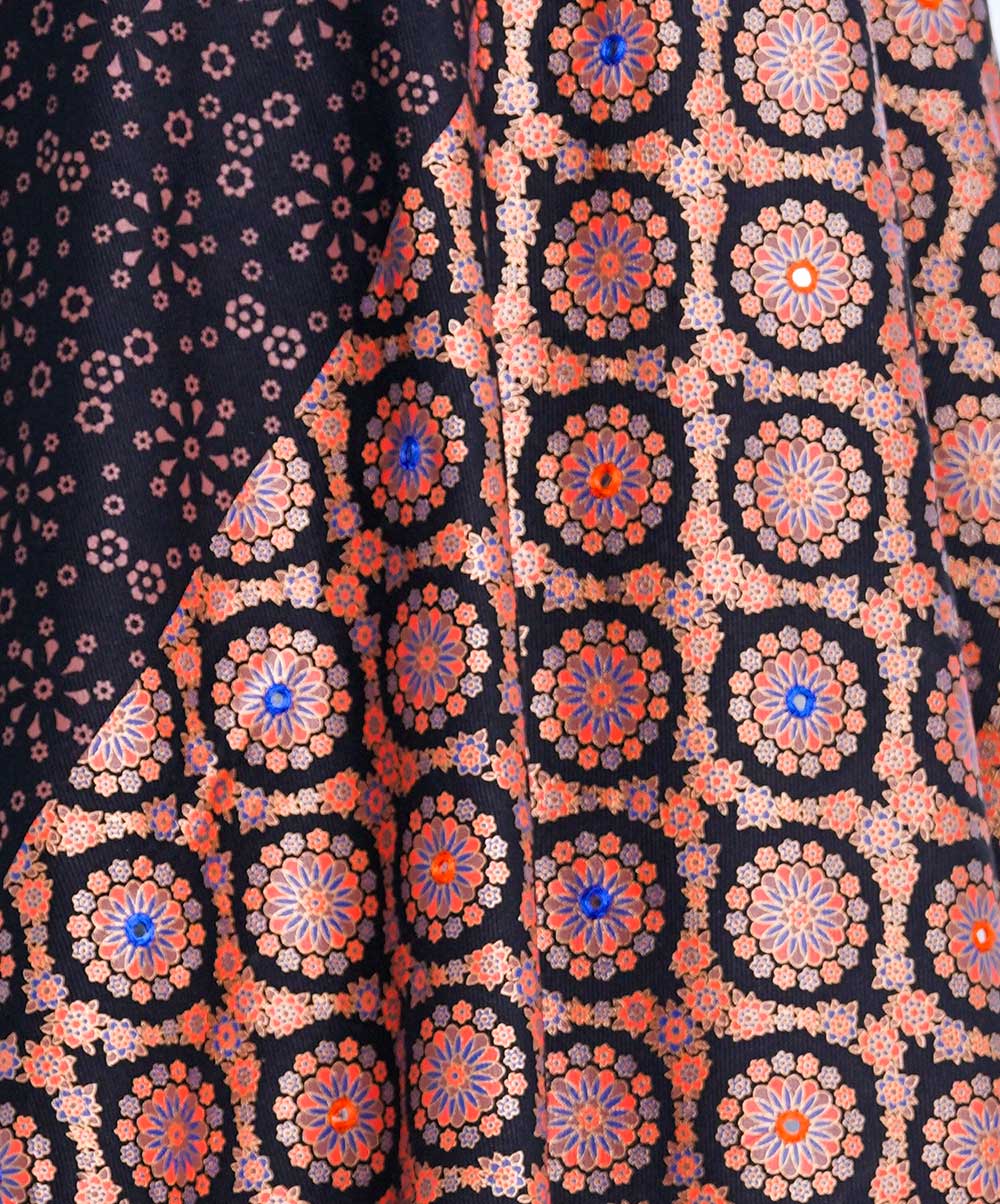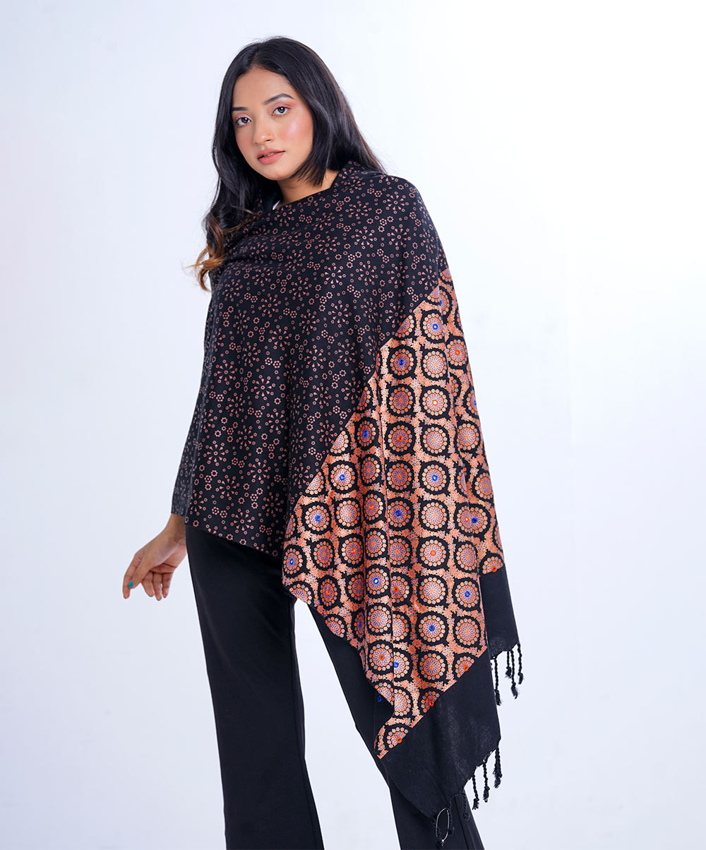 Black all-over printed Shawl in Cotton viscose fabric. Embellished with karchupi and fringe trim on both sides.