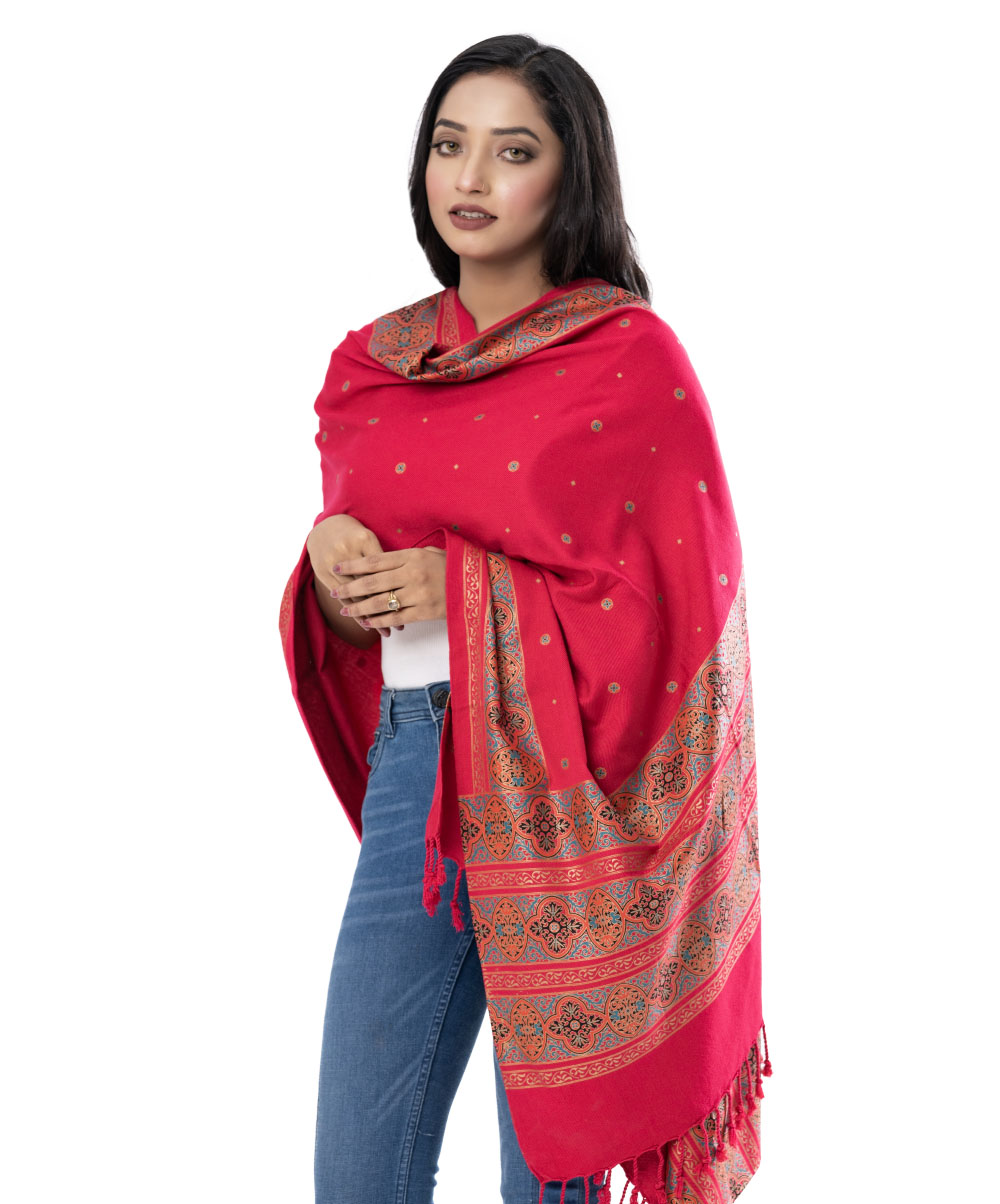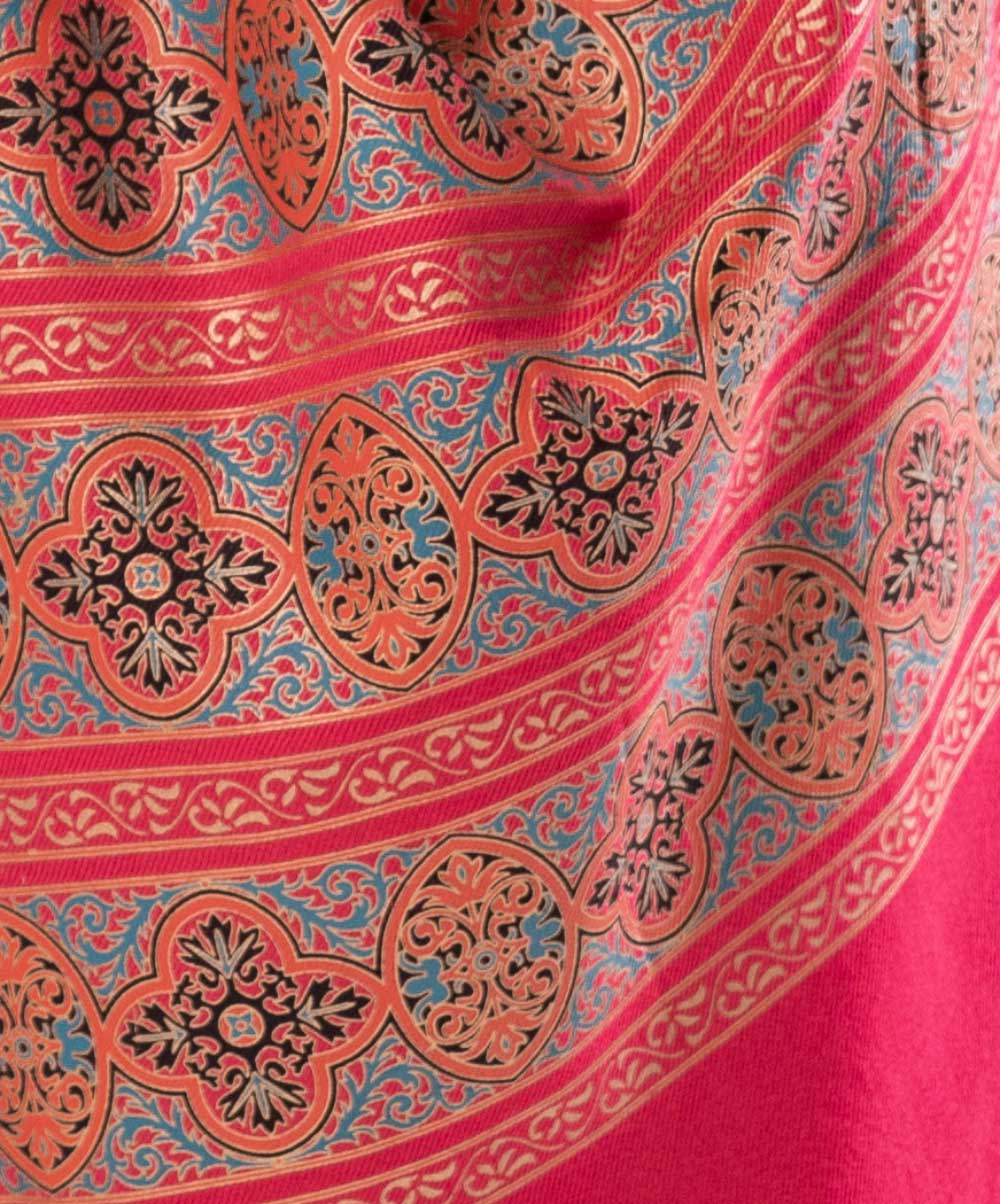 Pink all-over printed Shawl in Viscose-cotton fabric. Embellished with fringe trim on both sides.