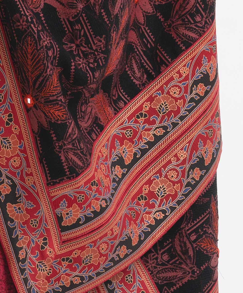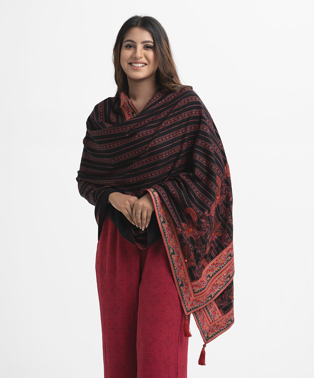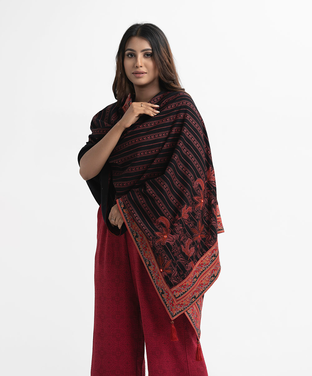 Women’s printed shawl in viscose fabric. Comes with embroidery, karchupi, patchwork and tassel at the border.