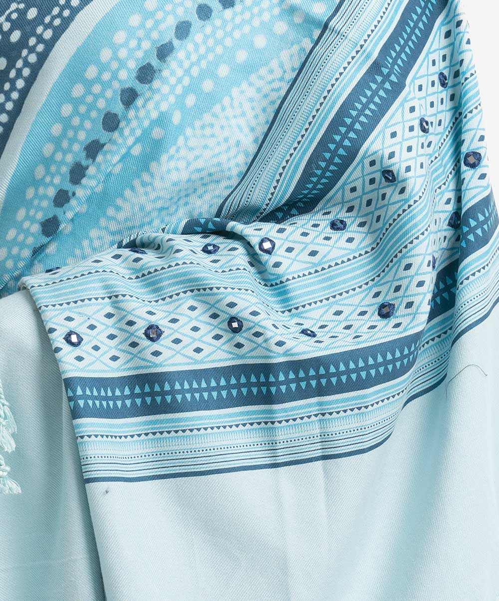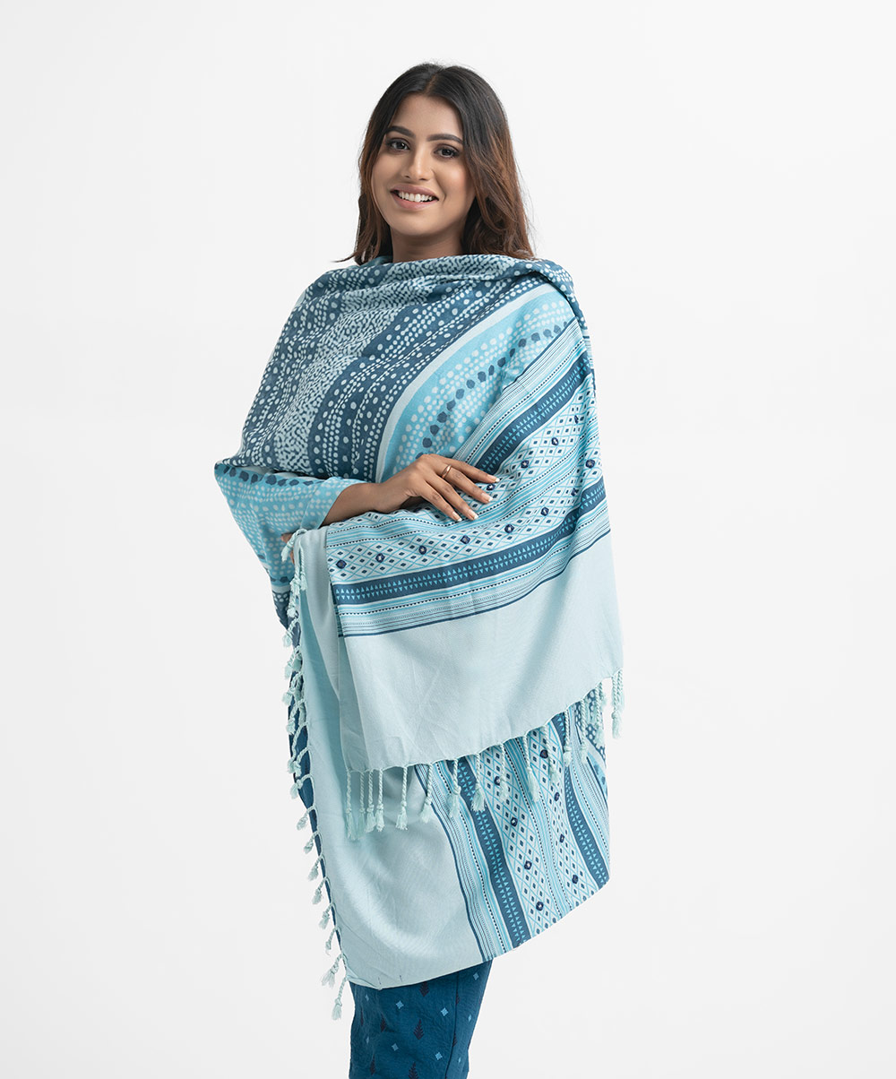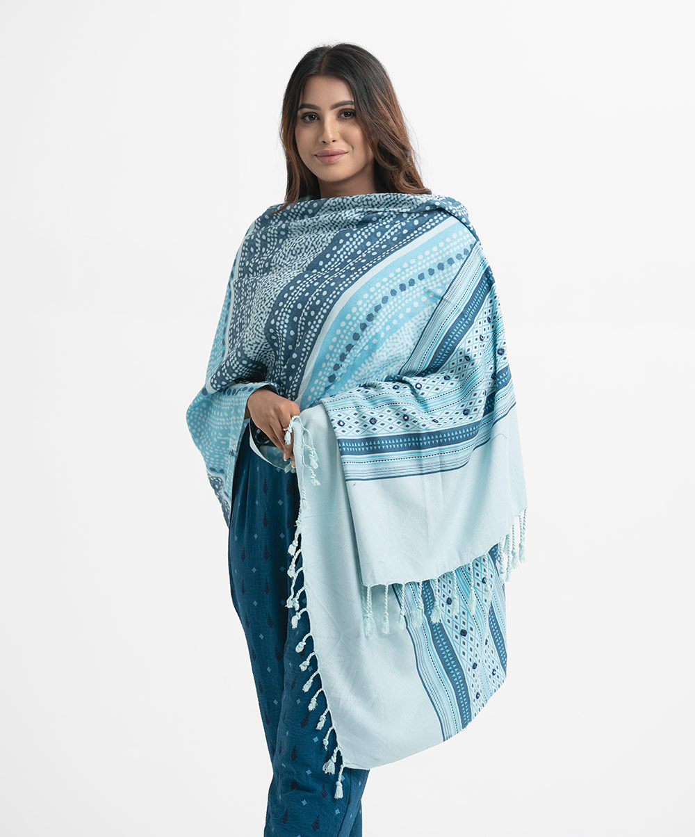 Women’s printed winter shawl in viscose fabric. Comes with karchupi and fringe trim at the border.