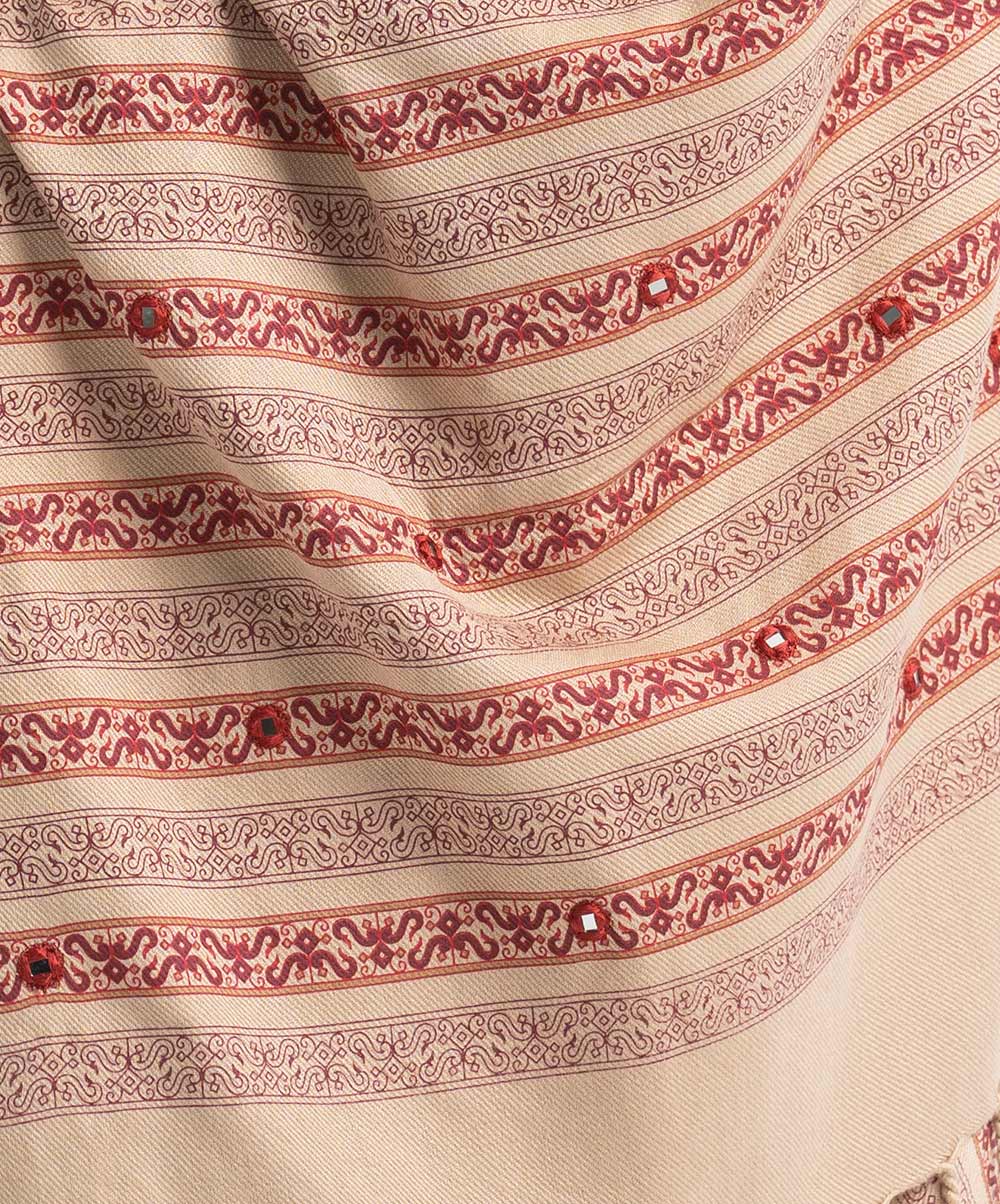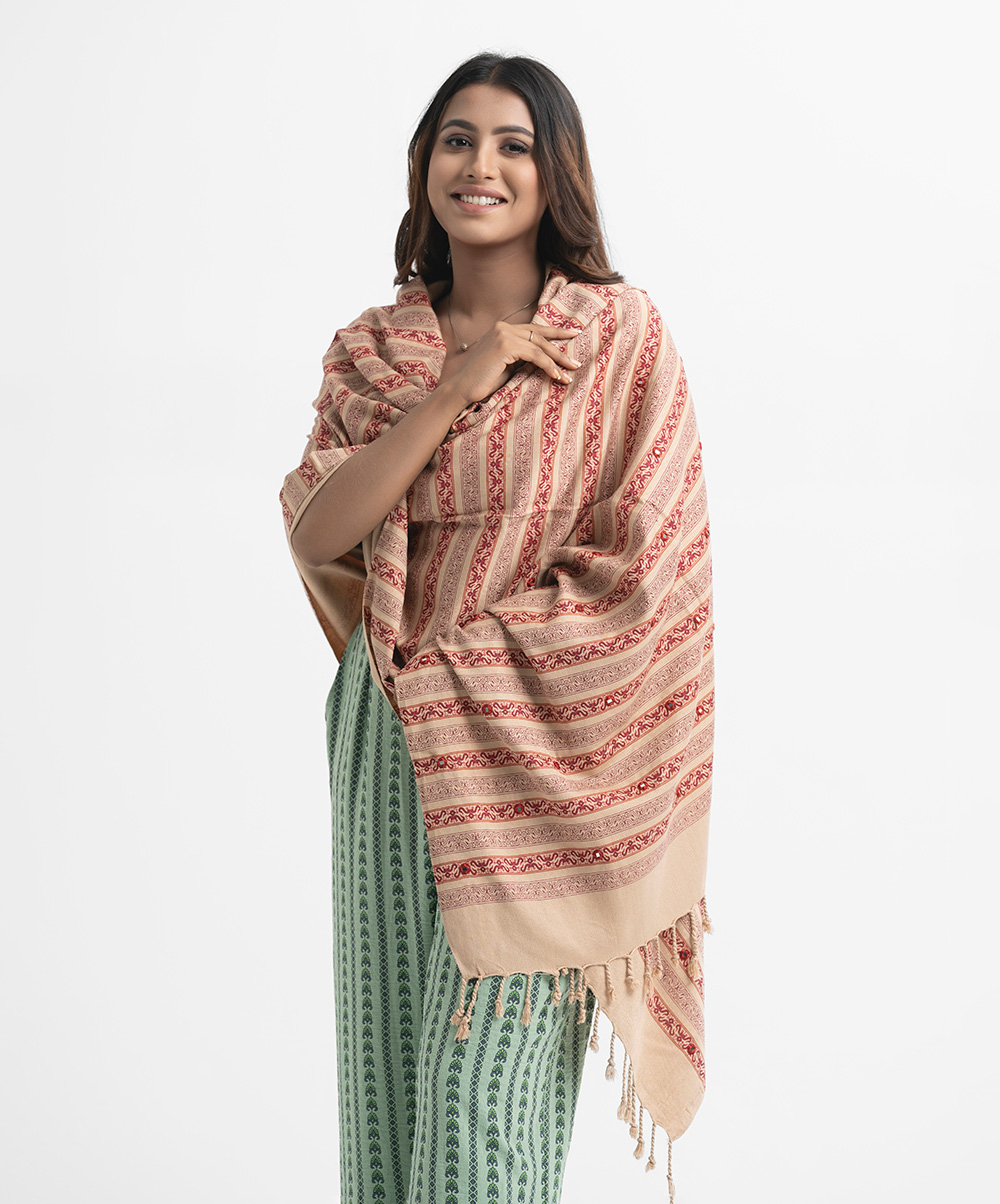 Women’s printed winter shawl in viscose fabric. Comes with karchupi and fringe trim at the border.