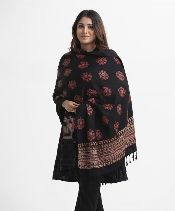 Women’s floral printed shawl in viscose fabric. Comes with karchupi at the borders and fringe trim.