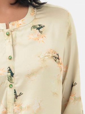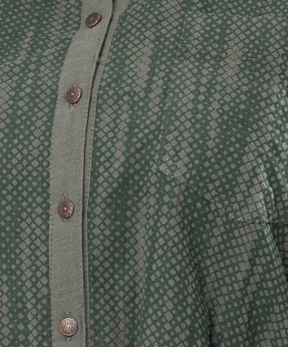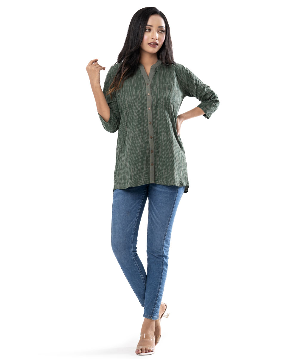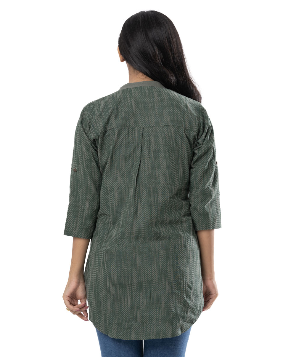 Green all-over printed A-line ladies’ Shirt in Cotton fabric. Features a band neck with buttons opening at the front and roll-up sleeves. Designed with a pocket at the top front. High low hemline.