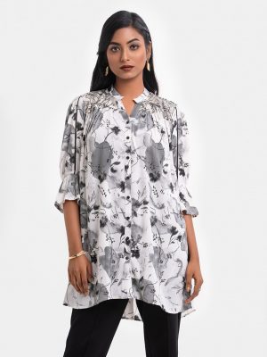 Ladie’s printed shirt in chambray fabric. Band collar, long-sleeved. Button fasting and pattern work at the front.