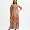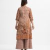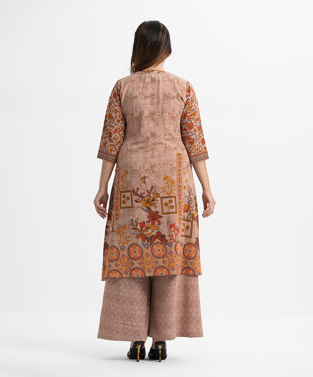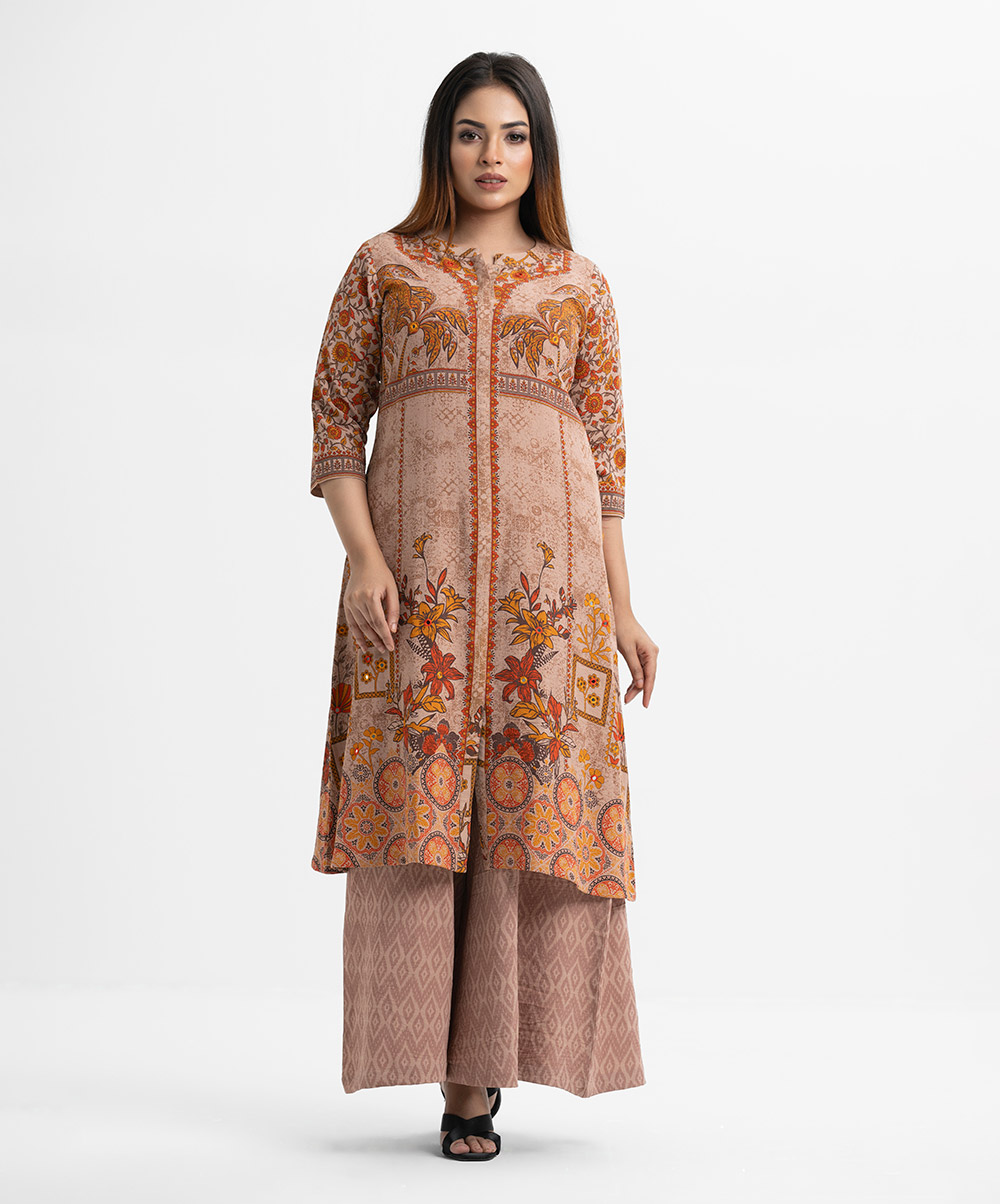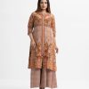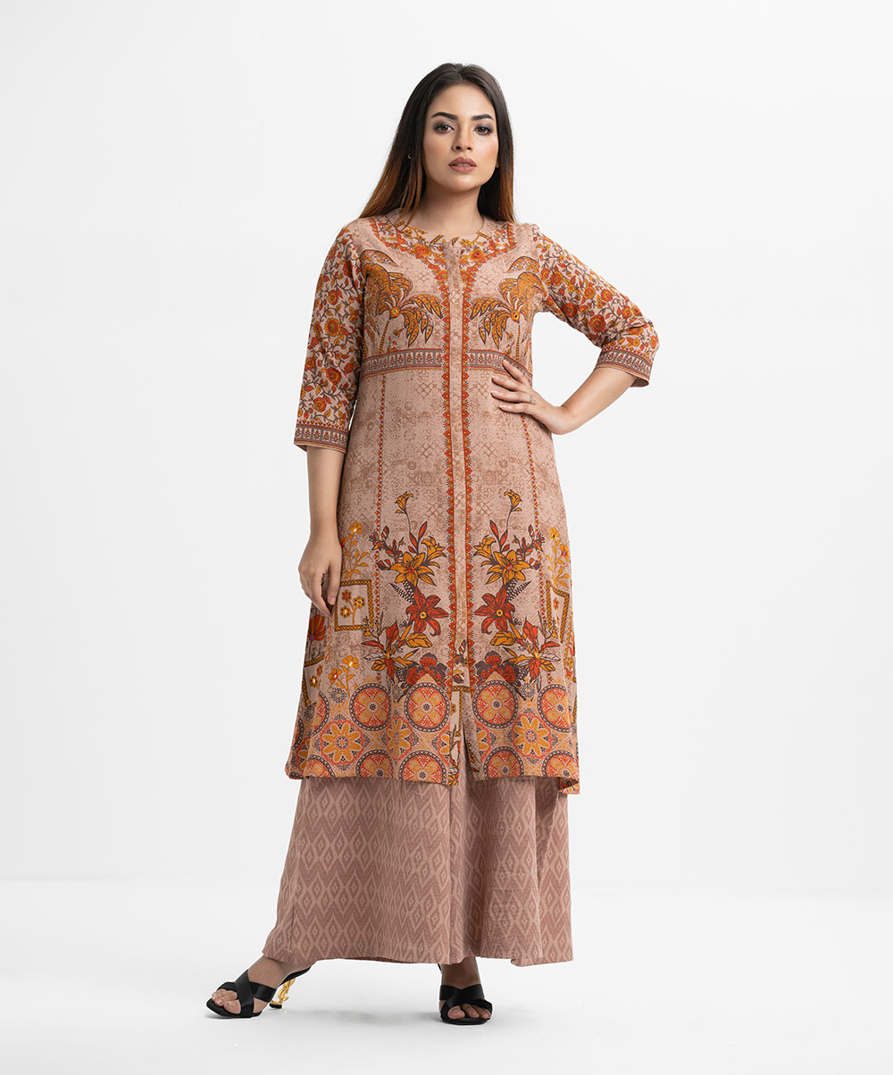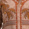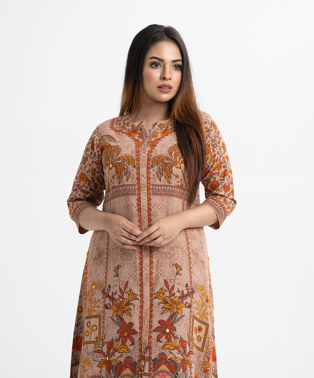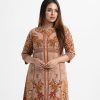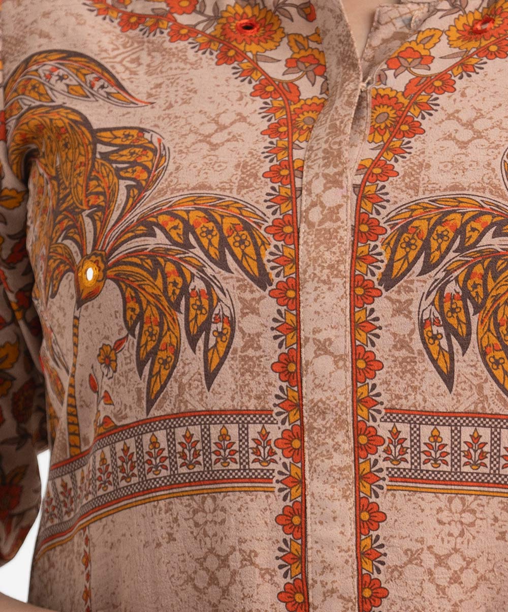 Ladies’ printed shirt in stretchable georgette fabric. Stand collar, three-quarter sleeves. Karchupi at front.