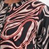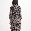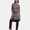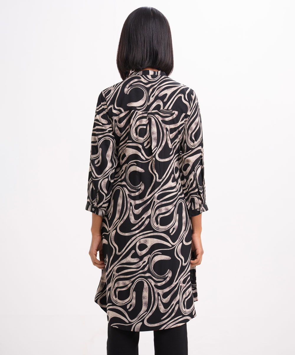 Ladies’ A-line shirt in printed georgette fabric. Stand collar with placket, buttons cuff sleeves. Embroidery patch at front and inseam pockets.