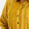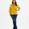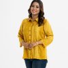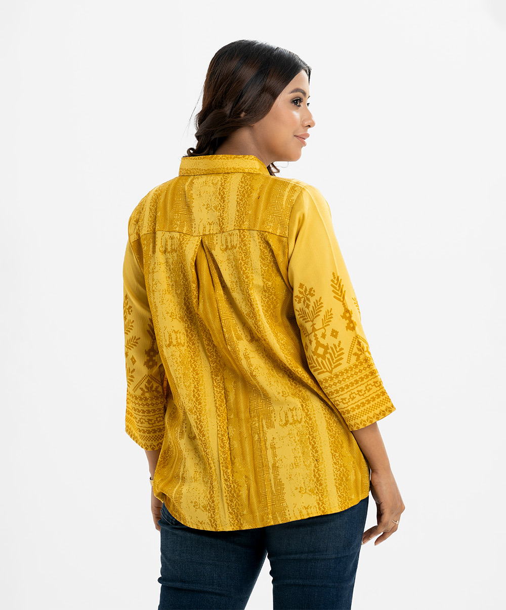 Women’s shirt in crepe fabric. Three-quarter sleeves, classic collar with metal buttons front opening.
