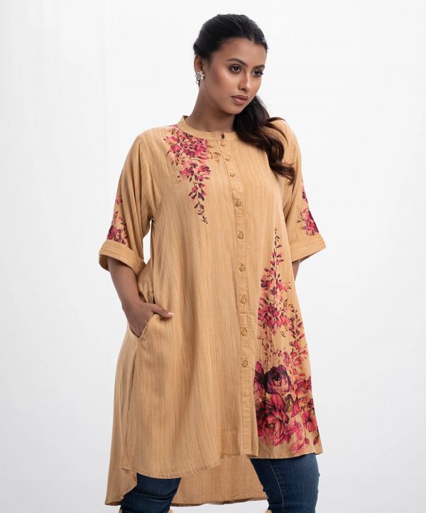 High-low hem shirt in viscose fabric.Band collar, three-quarter sleeves with folded cuffs.Inseam side pockets.