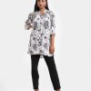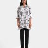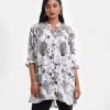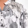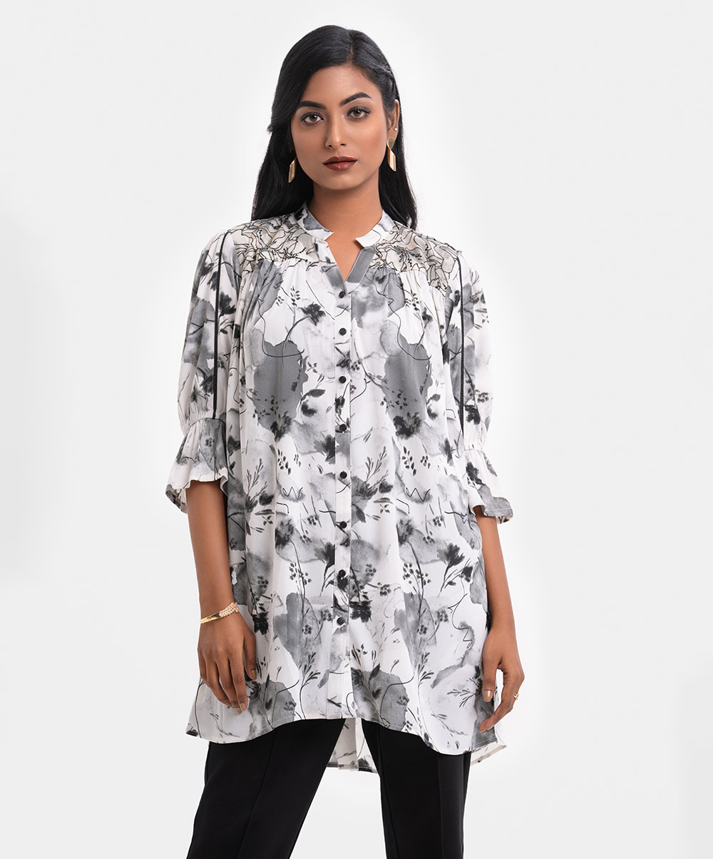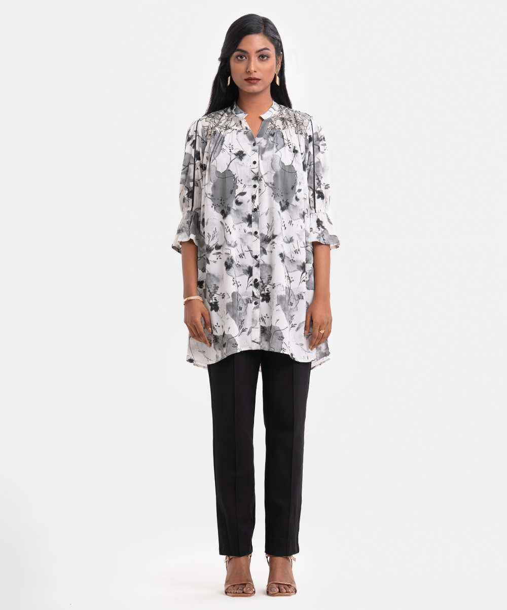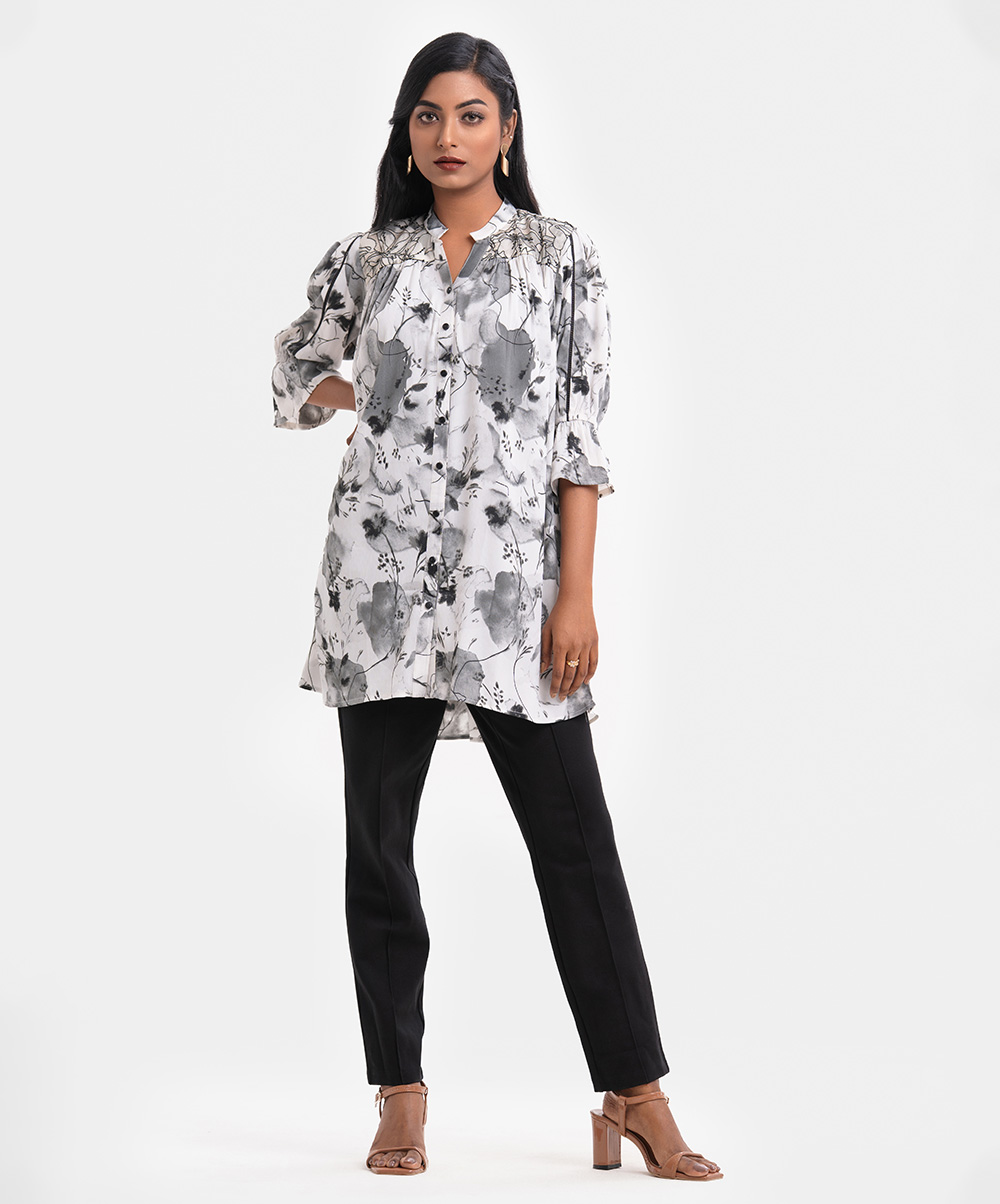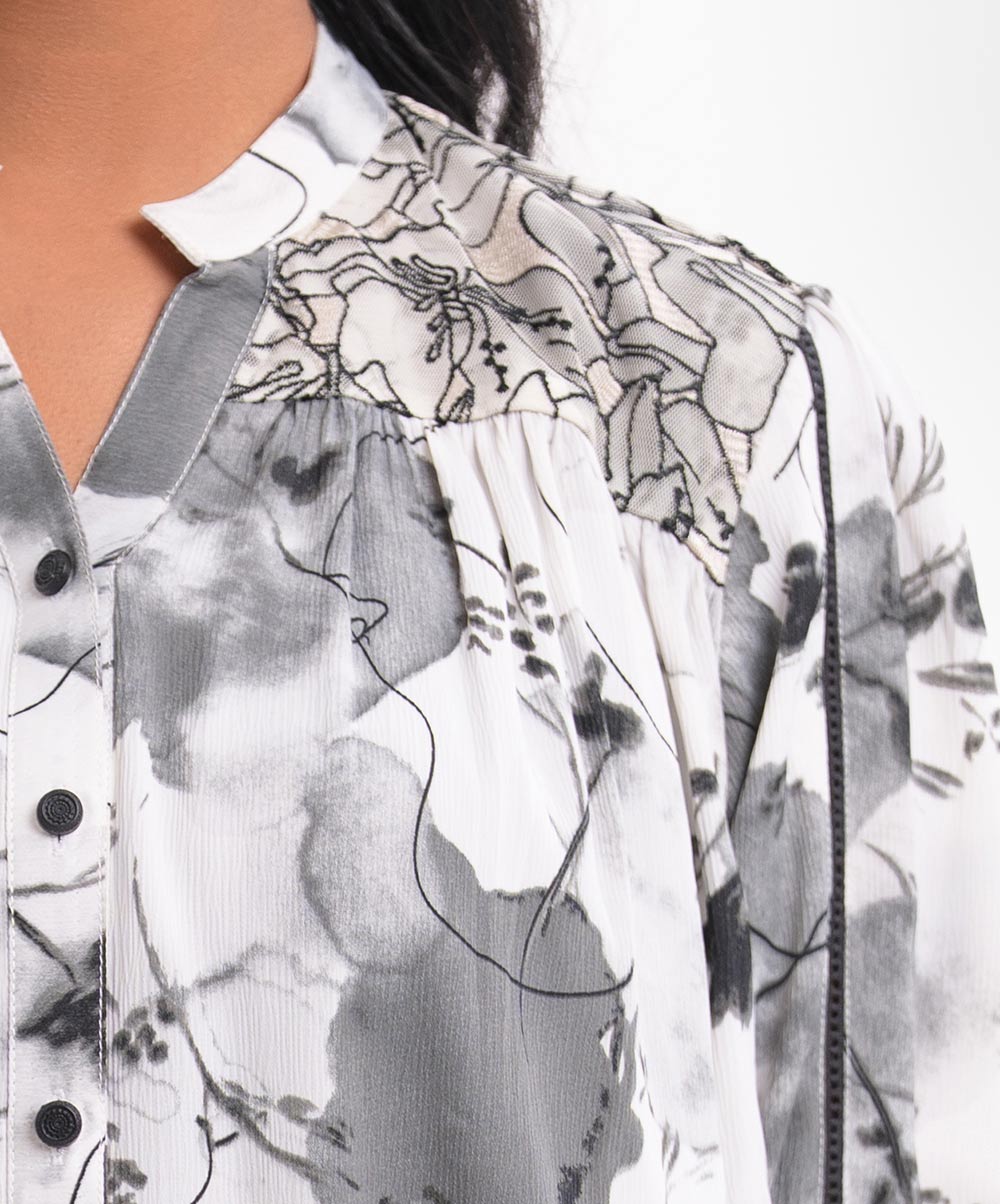 Ladies’ shirt in printed joom fabric. Stand collar, cut and sewn at three-quarter puff sleeves. Embroidered mesh fabric patch at back yoke and front. Inseam pockets.