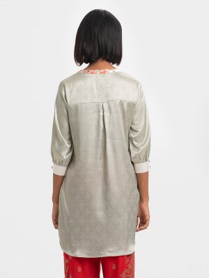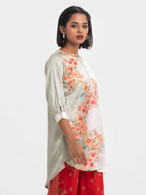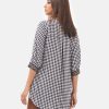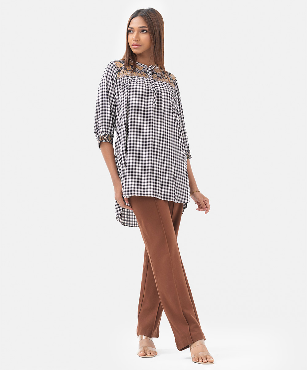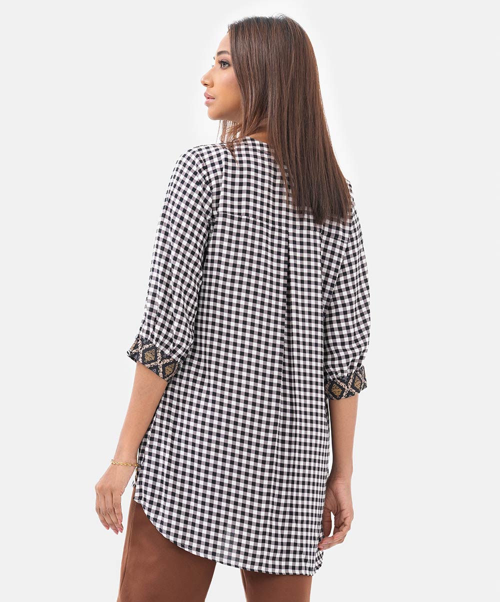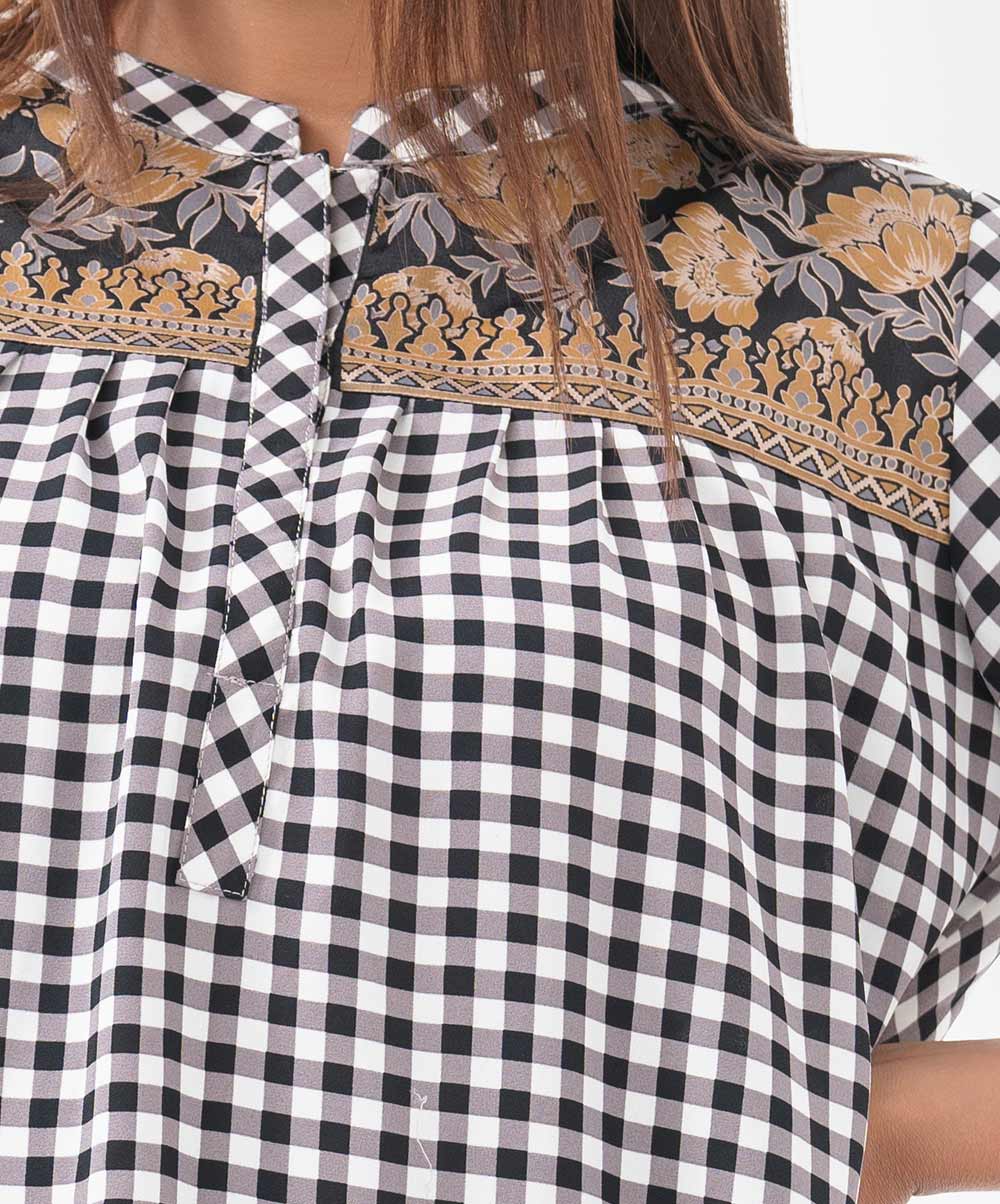 Ladies’ tent-style shirt in check printed georgette fabric. Stand collar with placket, cuff sleeves. Floral print patch at front.