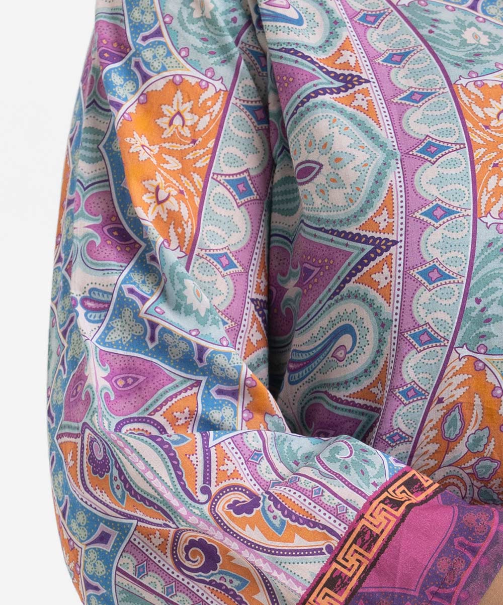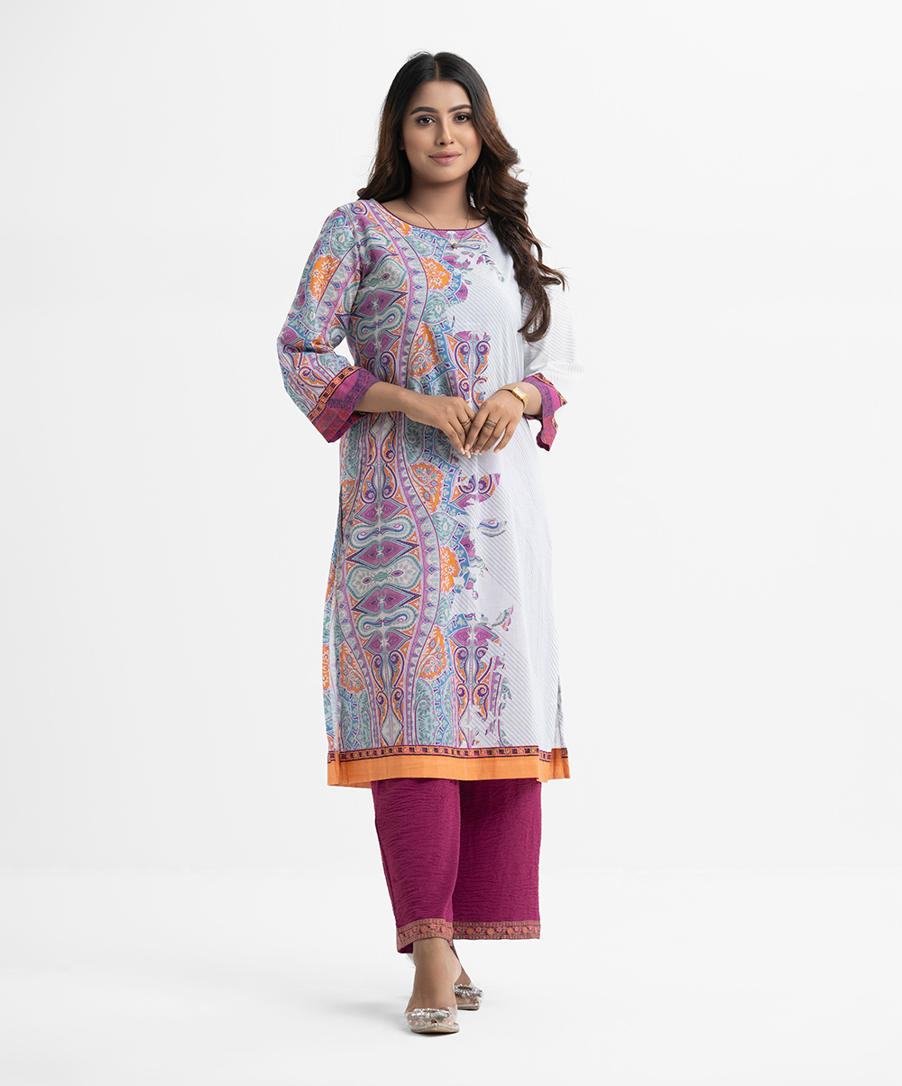 Women’s printed straight kameez in cotton fabric. Boat neck, three-quarter sleeves.
