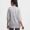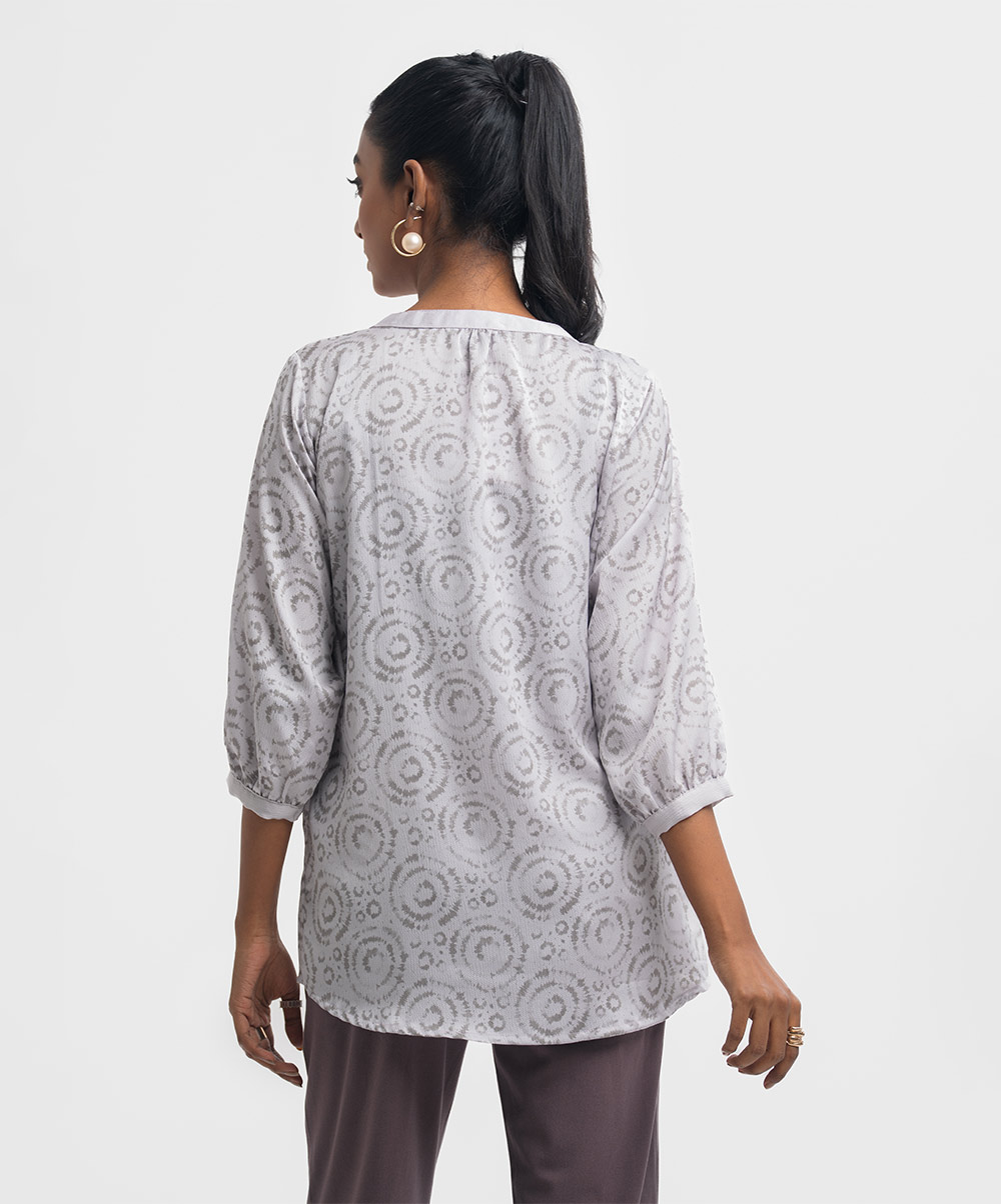 Patterned shirt in stretchable georgette fabric. Mock neck with button opening. Bishop sleeved.