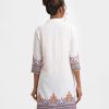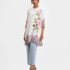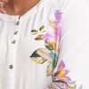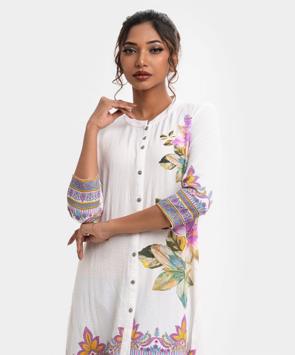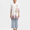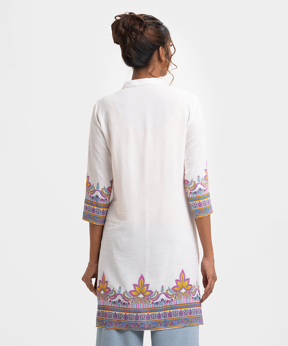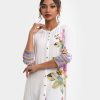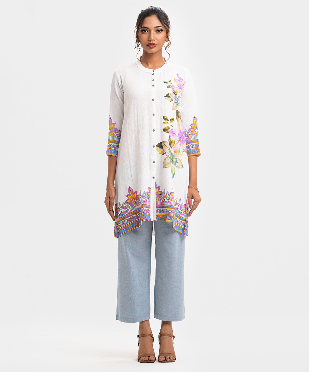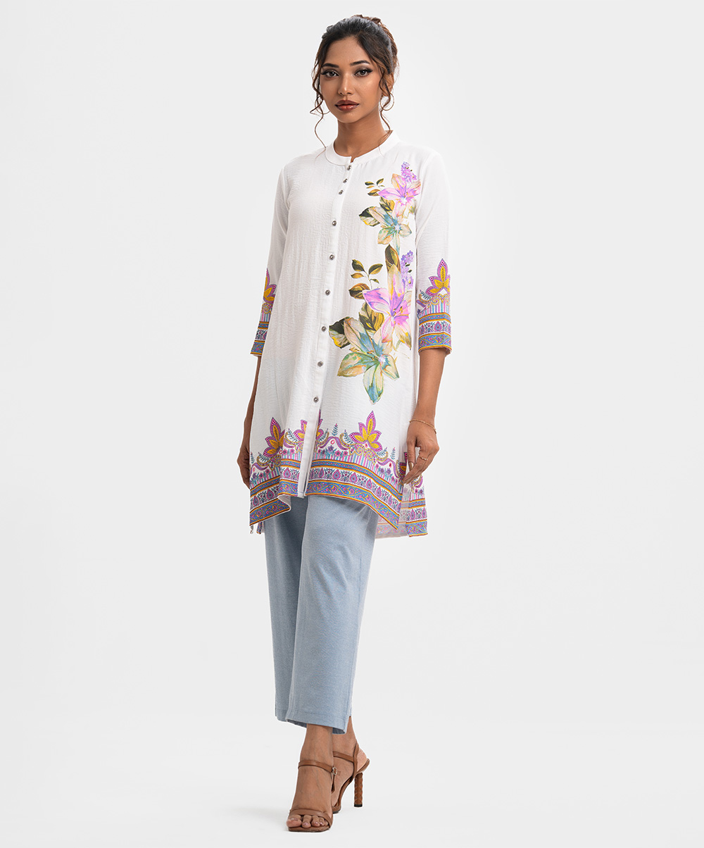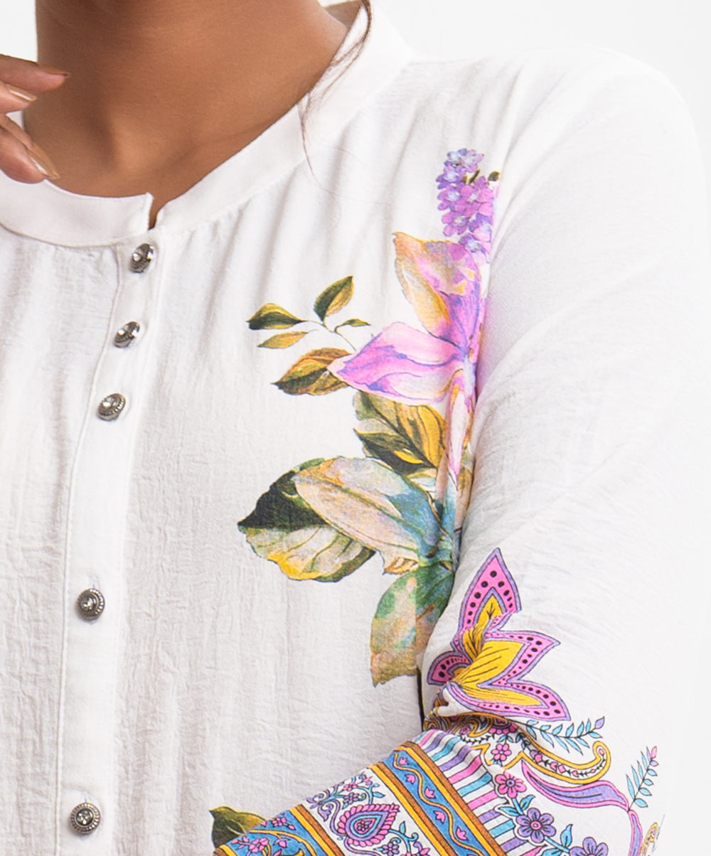 Ladies’ A-line shirt in stretched georgette fabric. Stand collar, three-quarter sleeves. Button fastening, floral print and karchupi at the front.