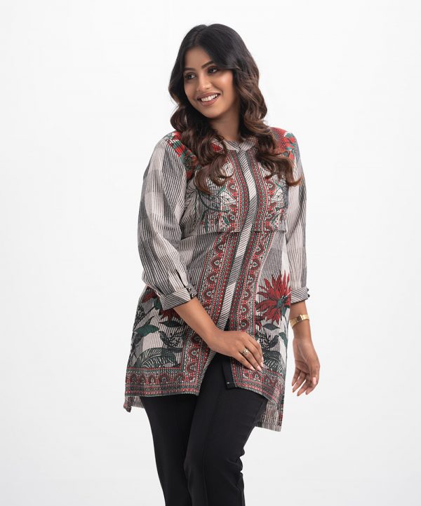 Women’s printed shirt in flannel fabric. Stand collar, long-sleeved. Slit at the front and high-low hem.