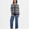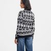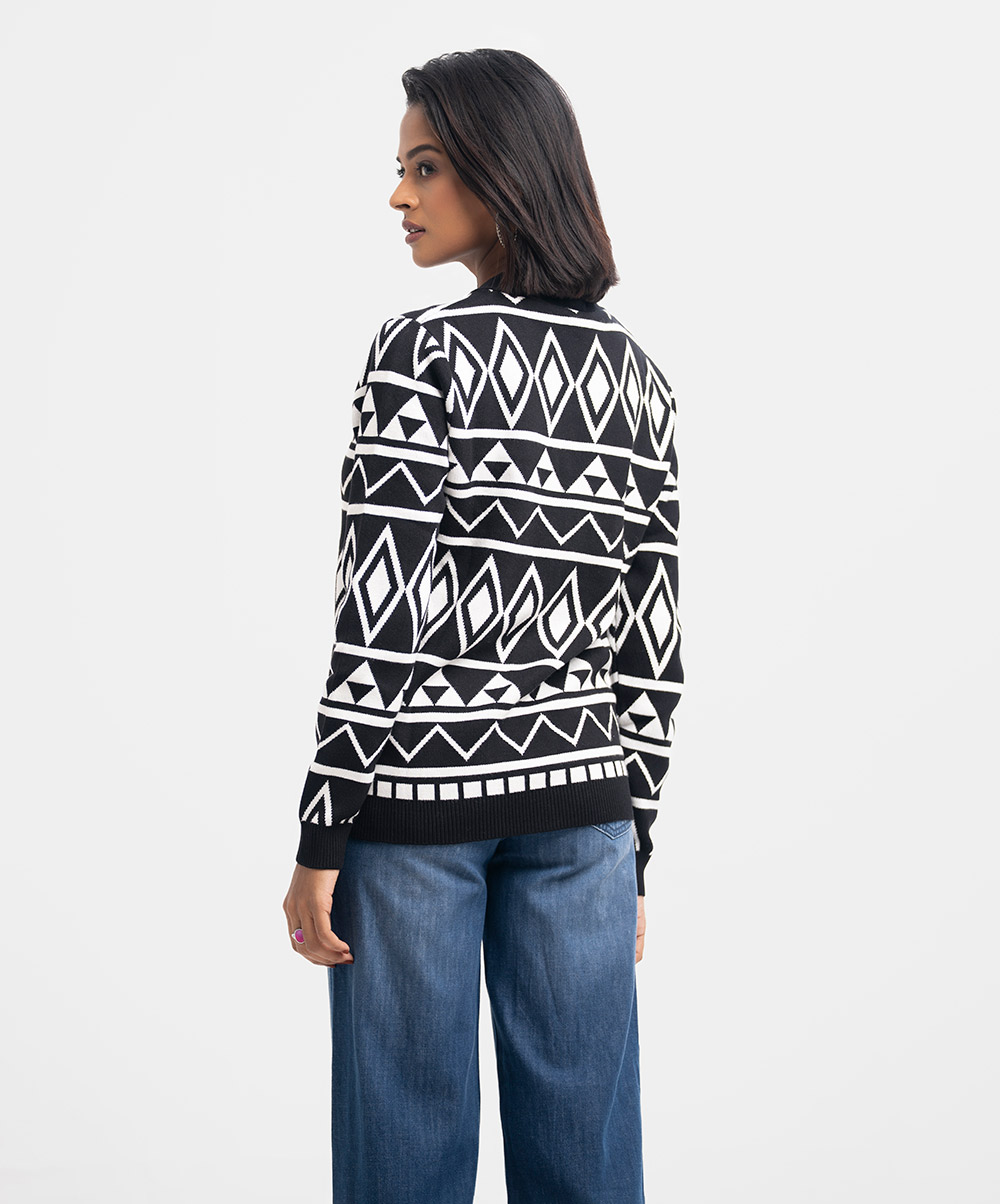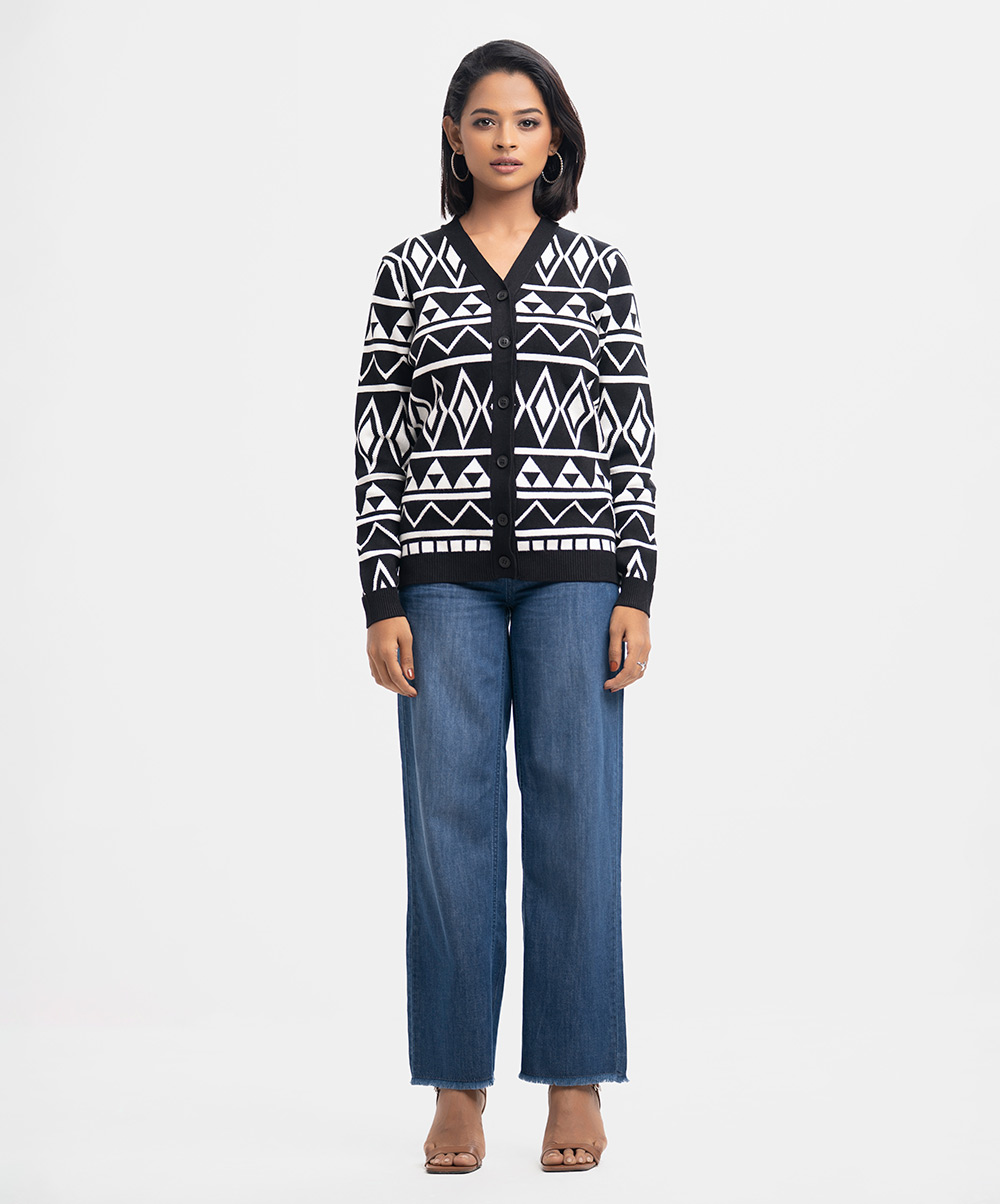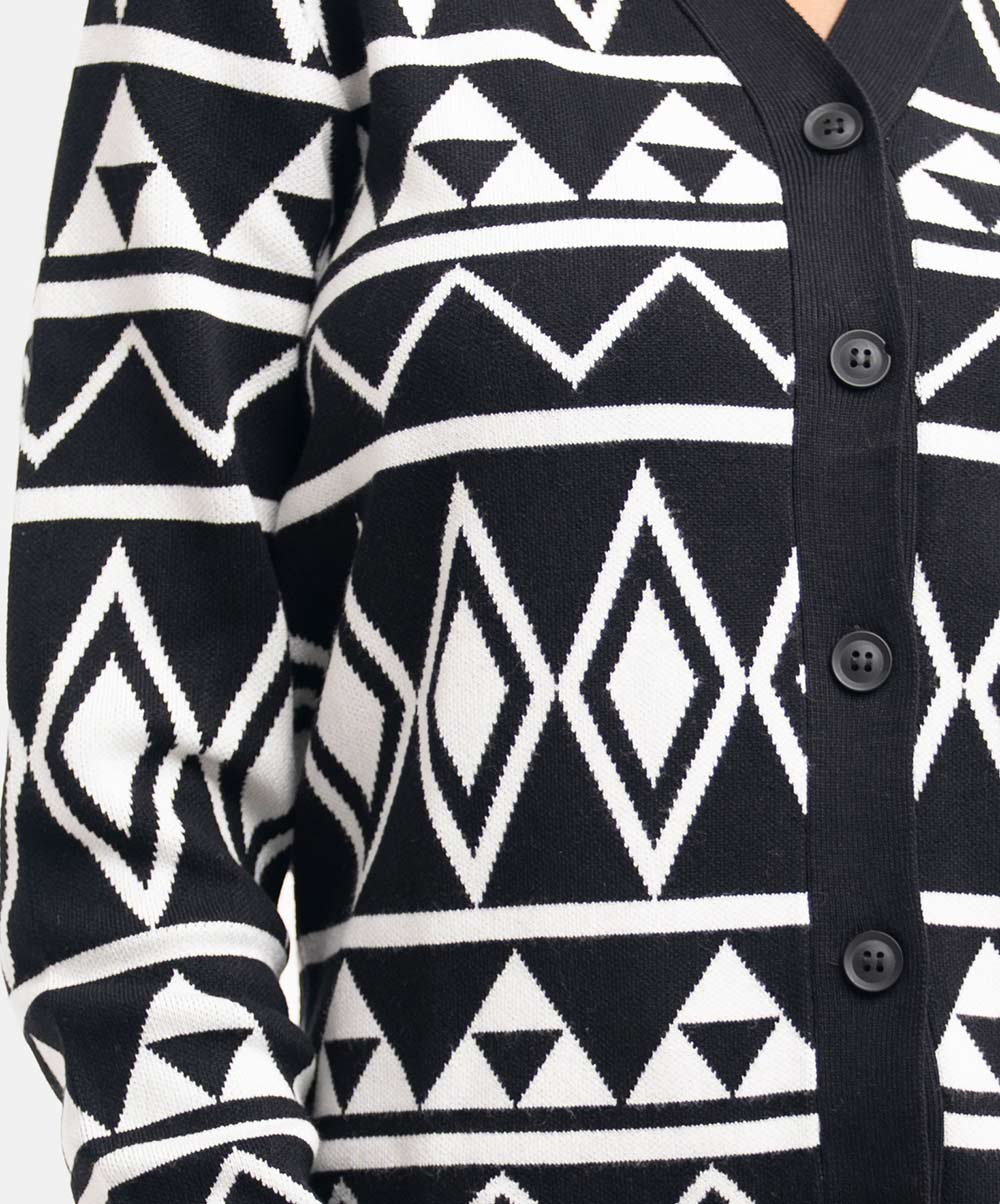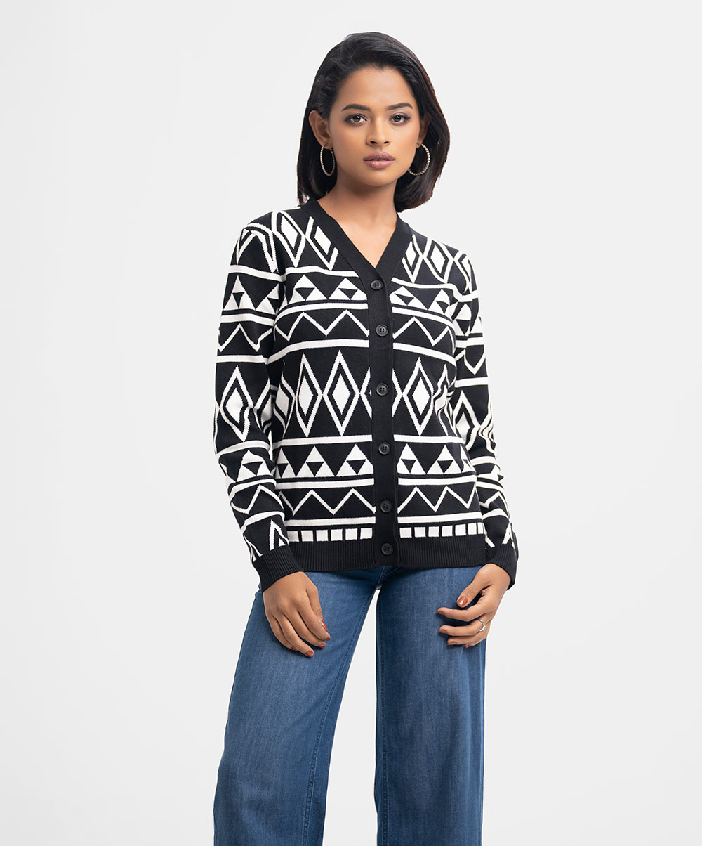 Women’s winter woven detail sweater in viscose blended knit fabric. V-neck, full sleeves and front buttons opening.
