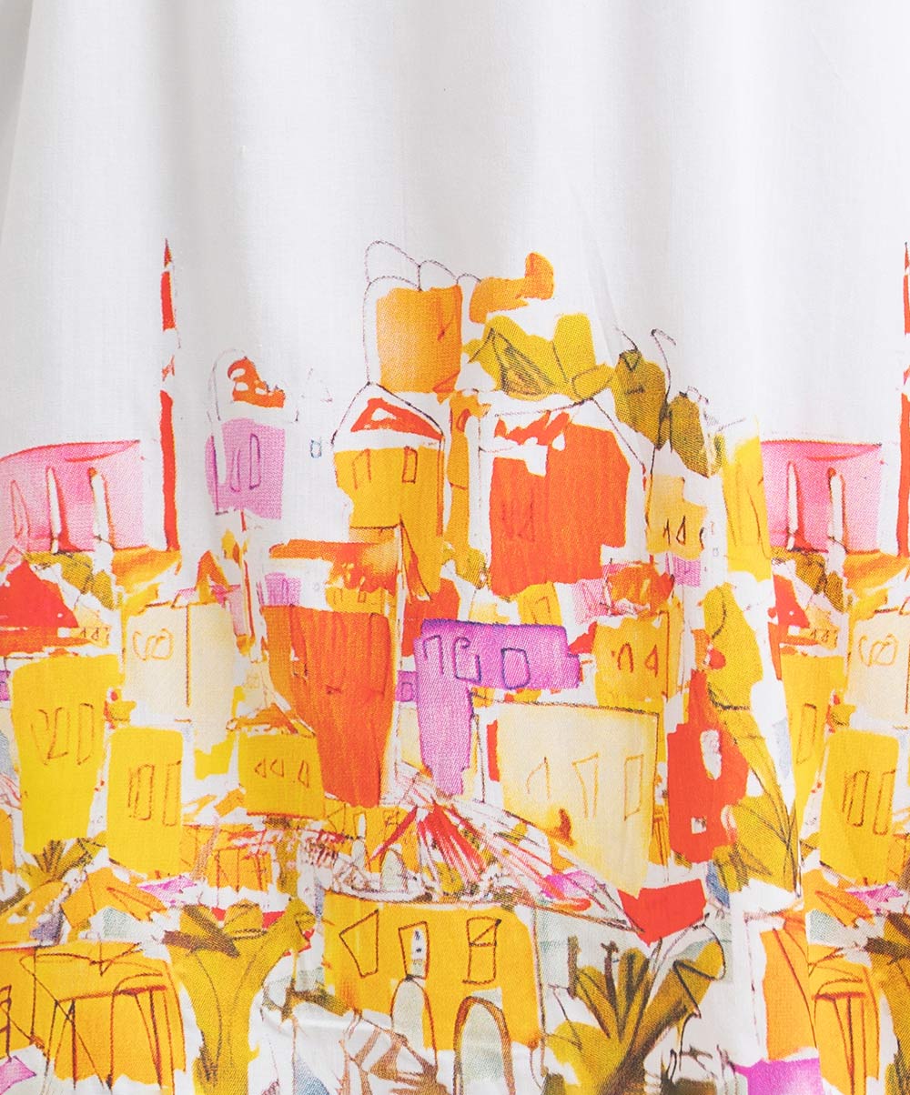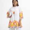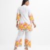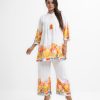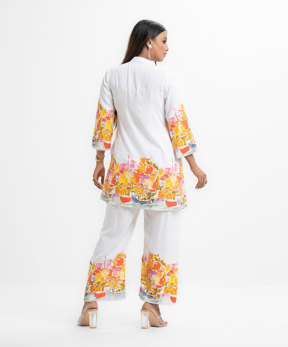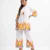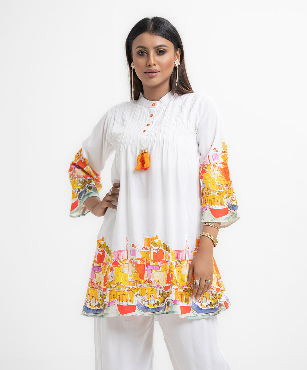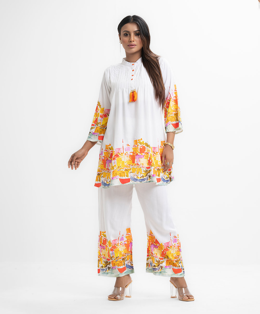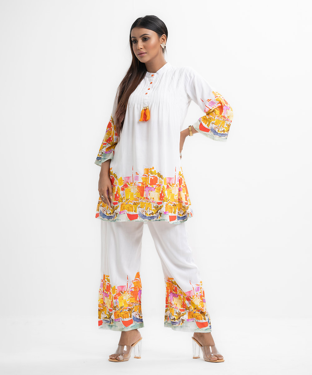 Women’s printed top bottom set in viscose fabric. Stand collar, bell sleeves, placket with tassel attached and pintuck at front of the top. Palazzo pants as the bottom.