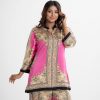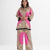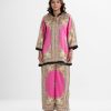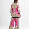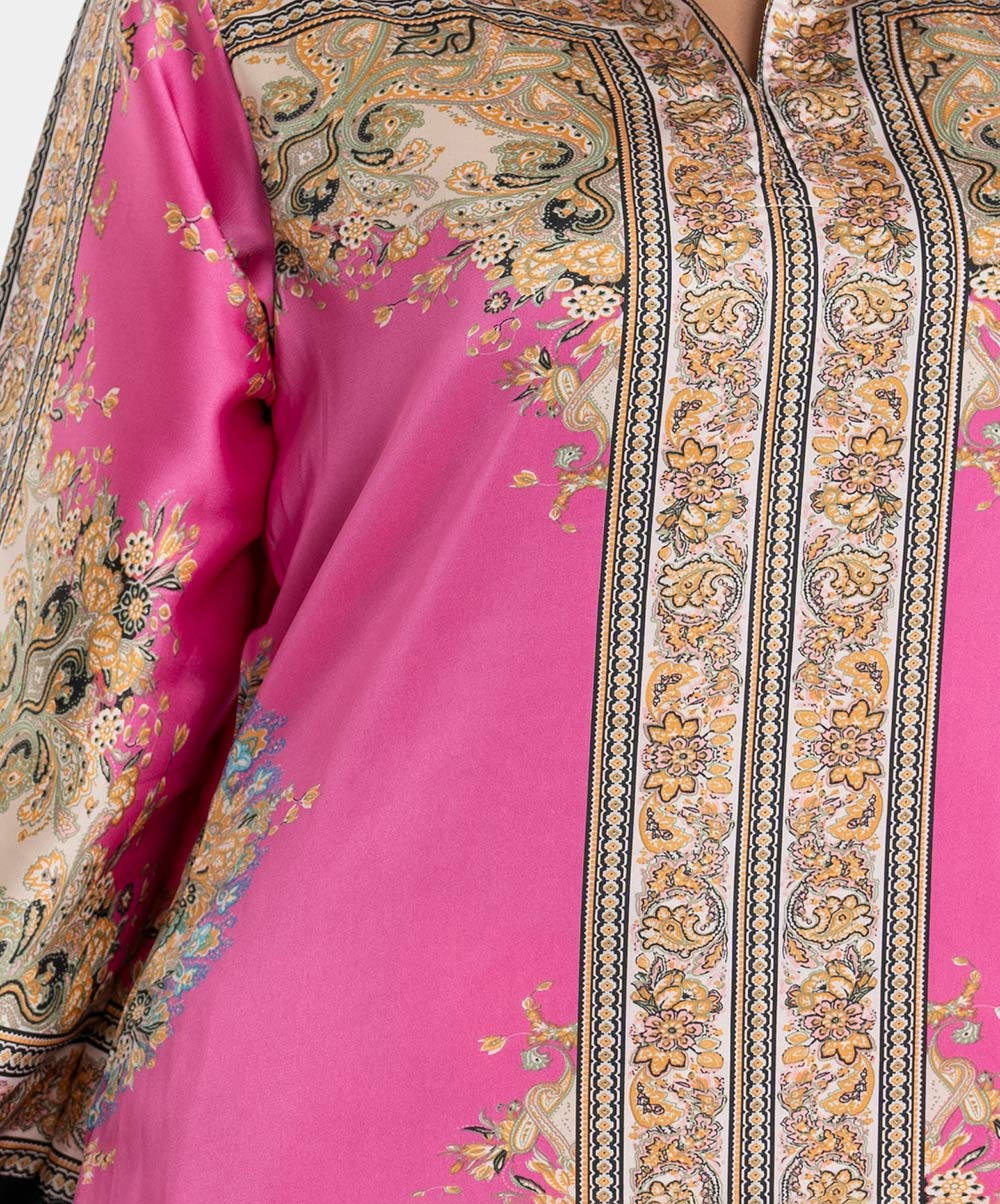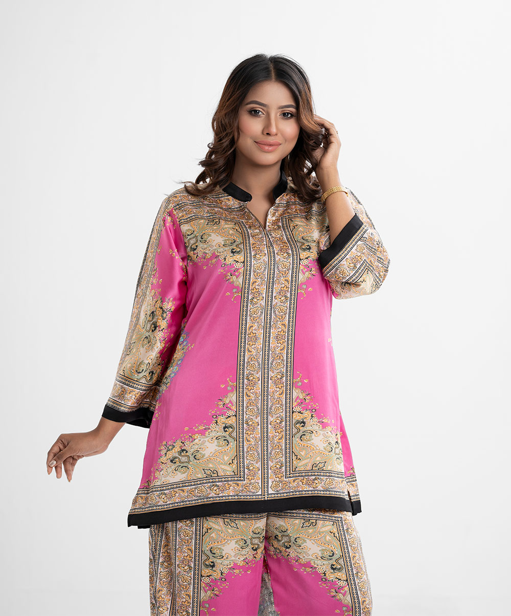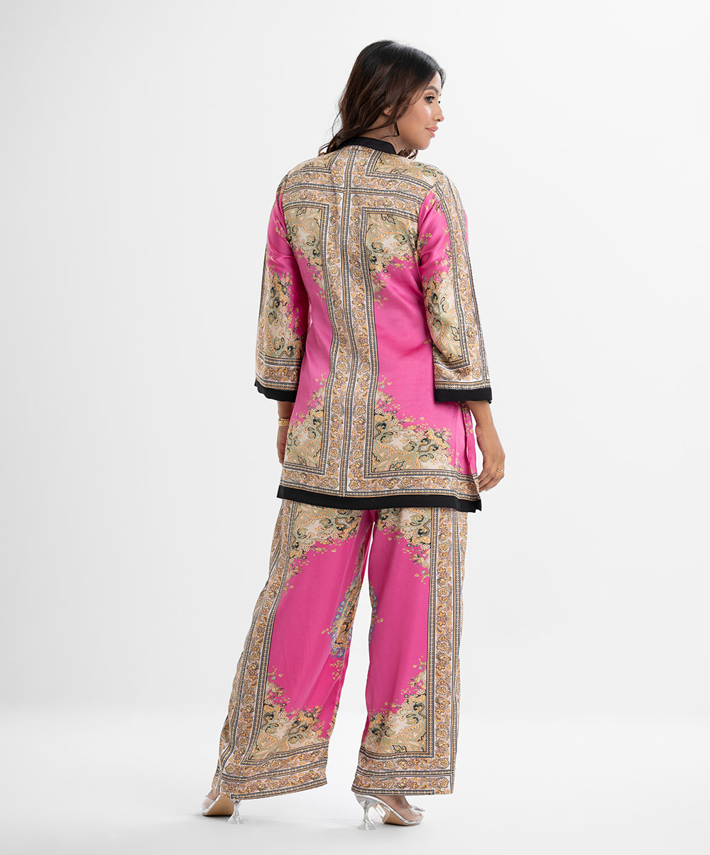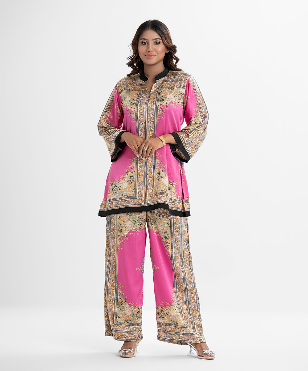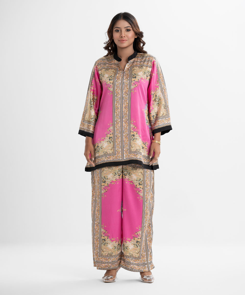 Women’s top bottom set in satin fabric. Mandarin collar, three-quarter sleeves. Straight palazzo pants as the bottom.