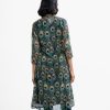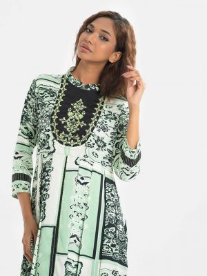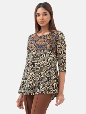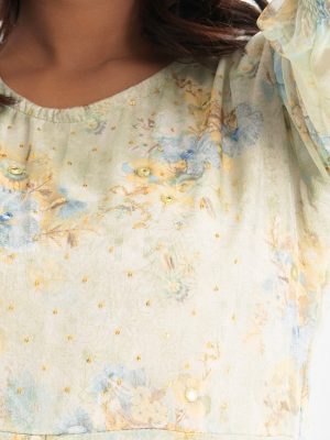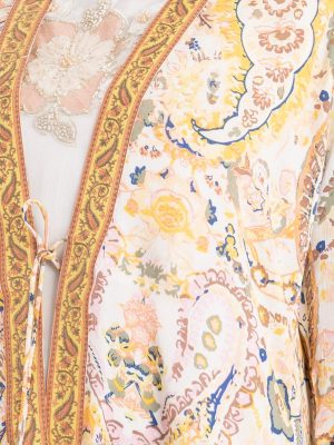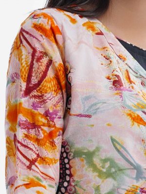 Front opening with tie-cord fastening, three-quarter sleeved, printed georgette fabric shrug with round neck sleeveless tunic.