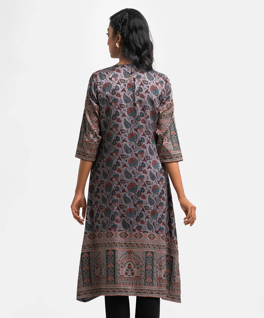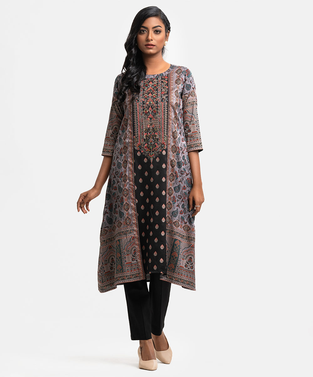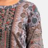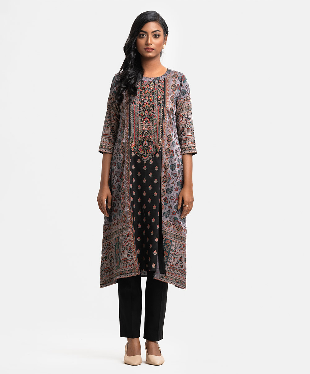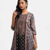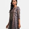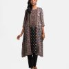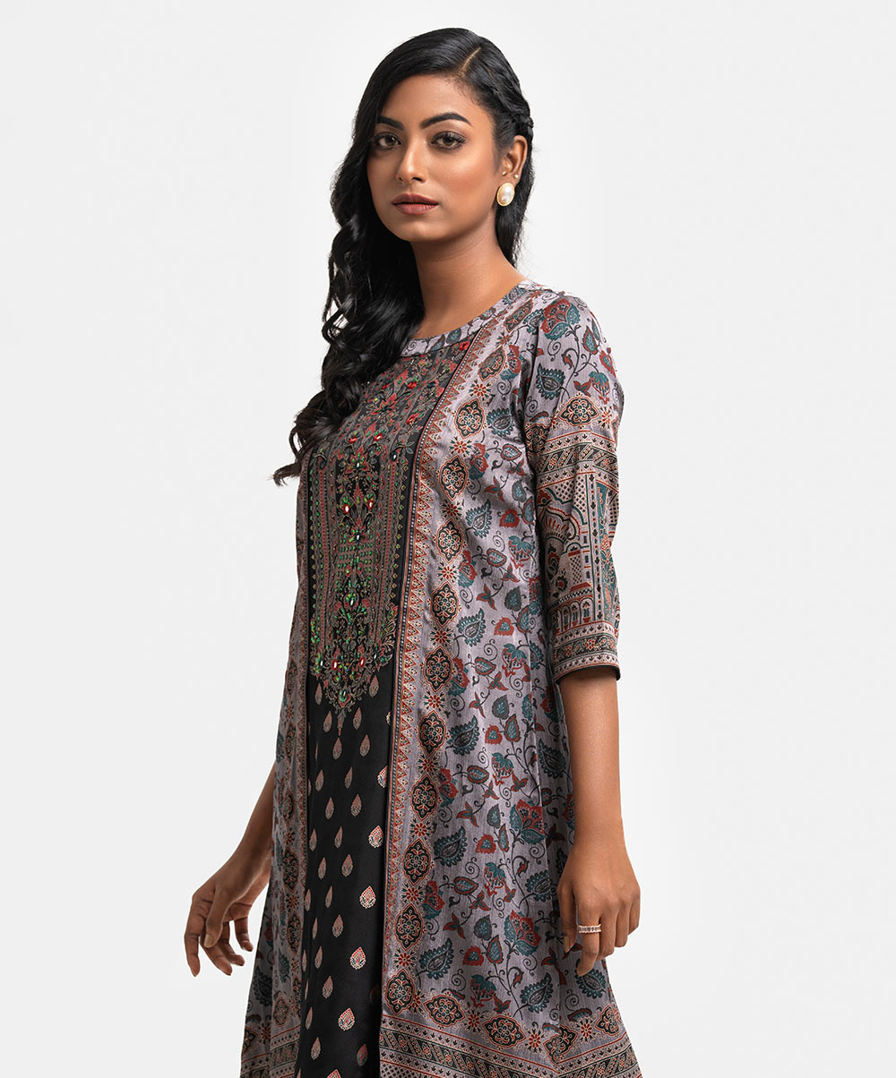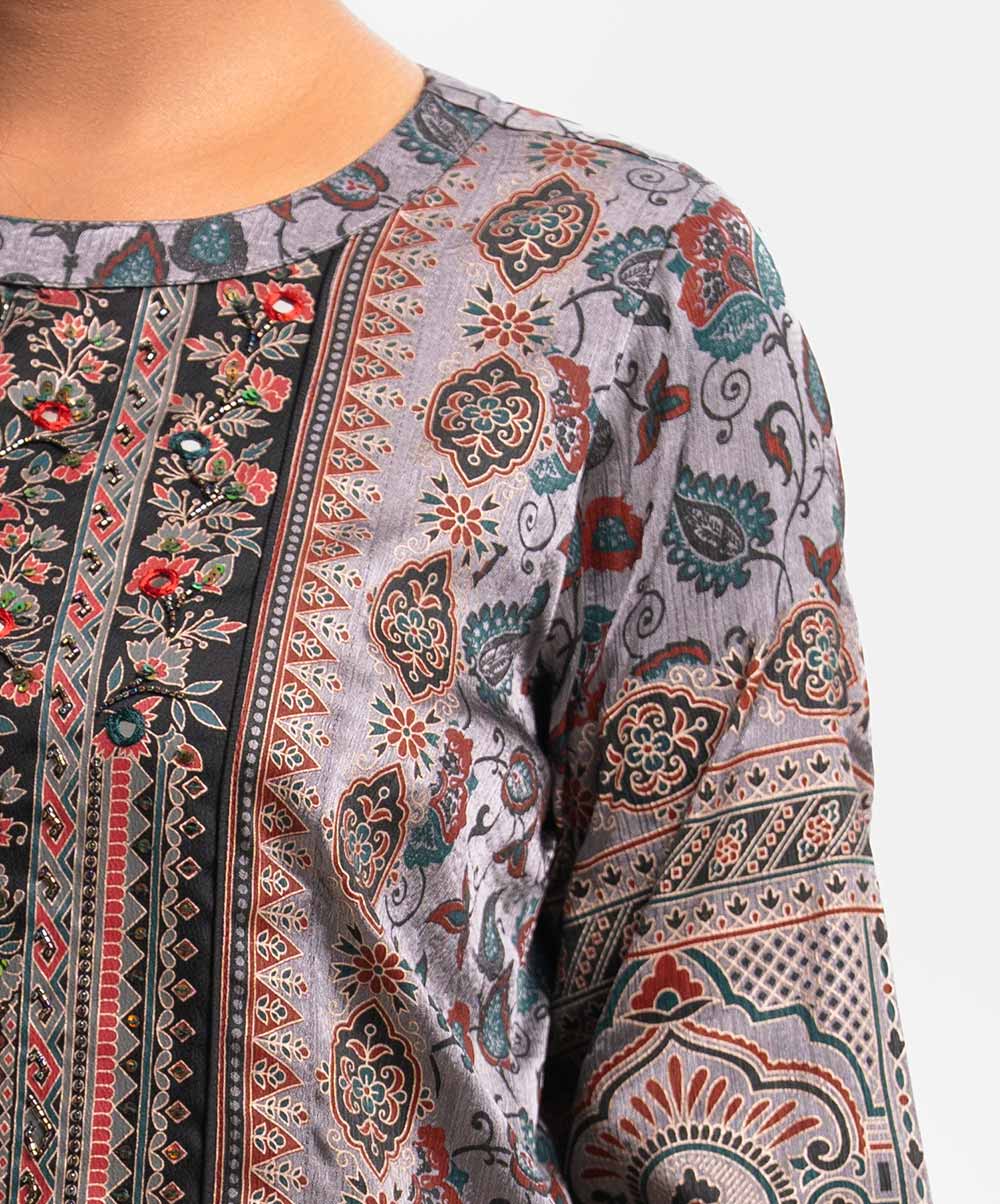 Shrug-style tunic with karchupi details in crepe and textured georgette fabric. Mock neck, three-quarter sleeves.