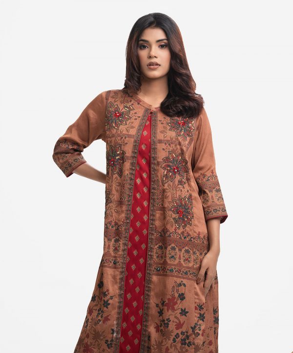 Women’s shrug attached tunic in textured georgette fabric. Stand collar with single button opening, three-quarter sleeves. Karchupi at front.