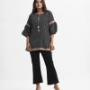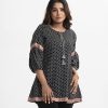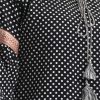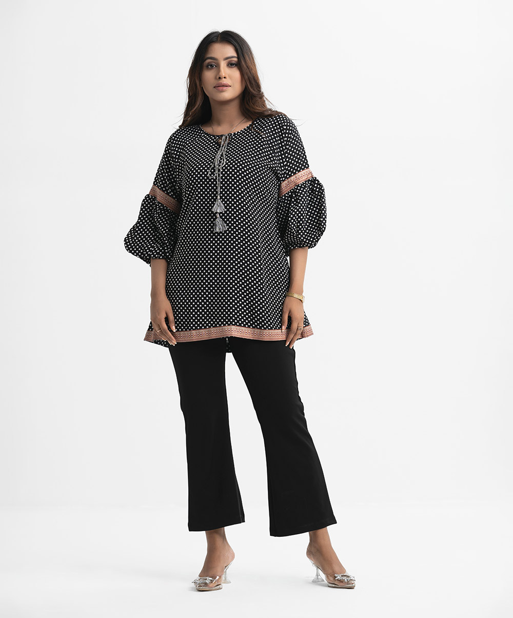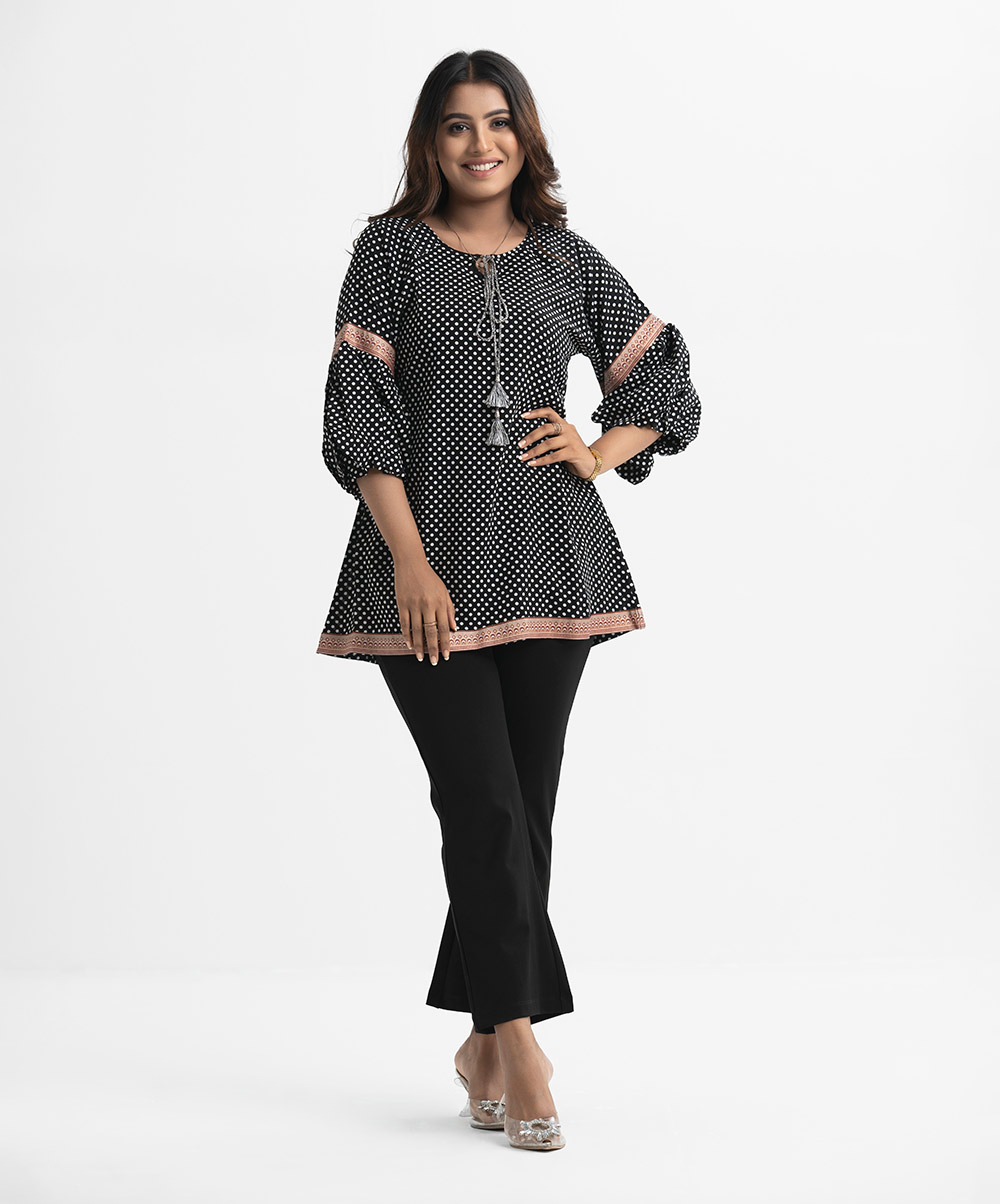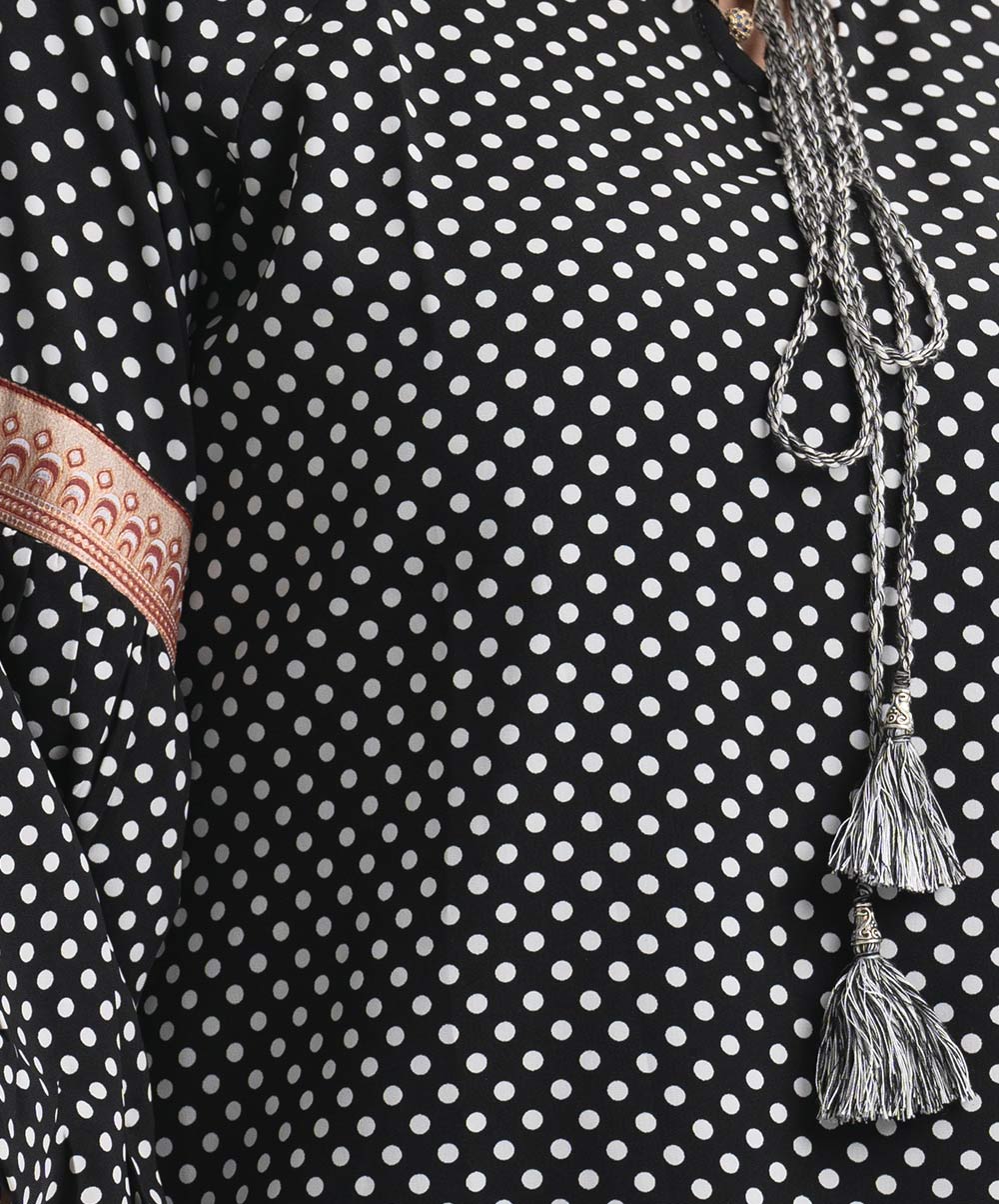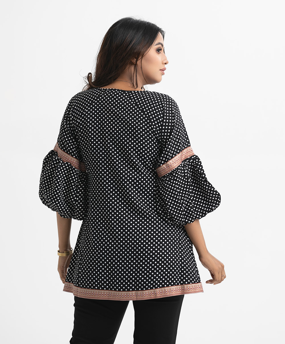 Women’s polka dot printed A-line woven top in georgette fabric. Round neck, balloon sleeves. Patchwork on sleeves and hemline.