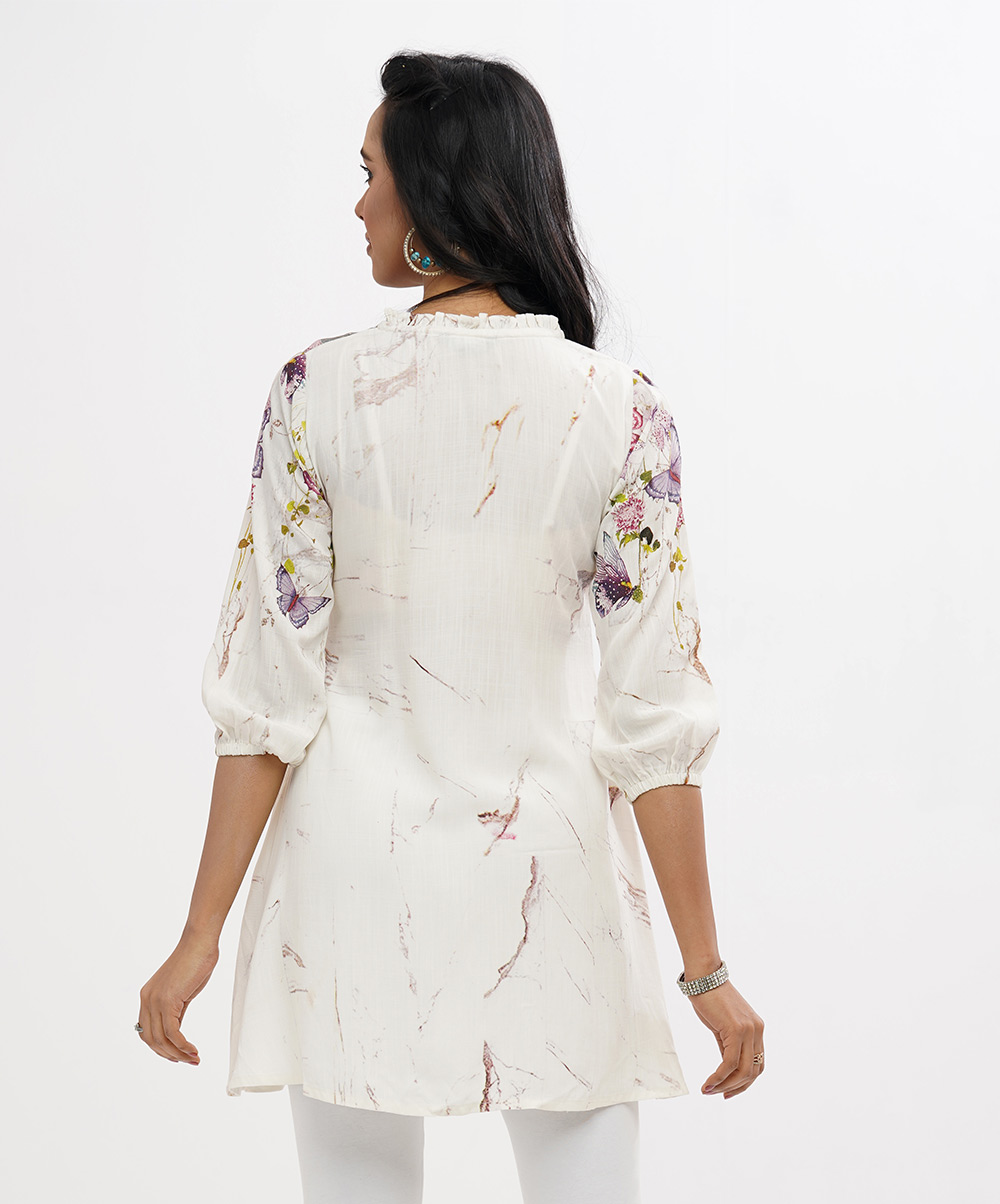 White printed viscose tunic with ruffles and drawstring on neckline and bishop sleeves.