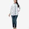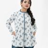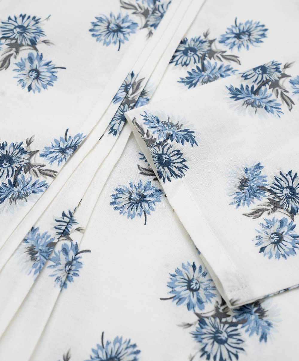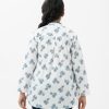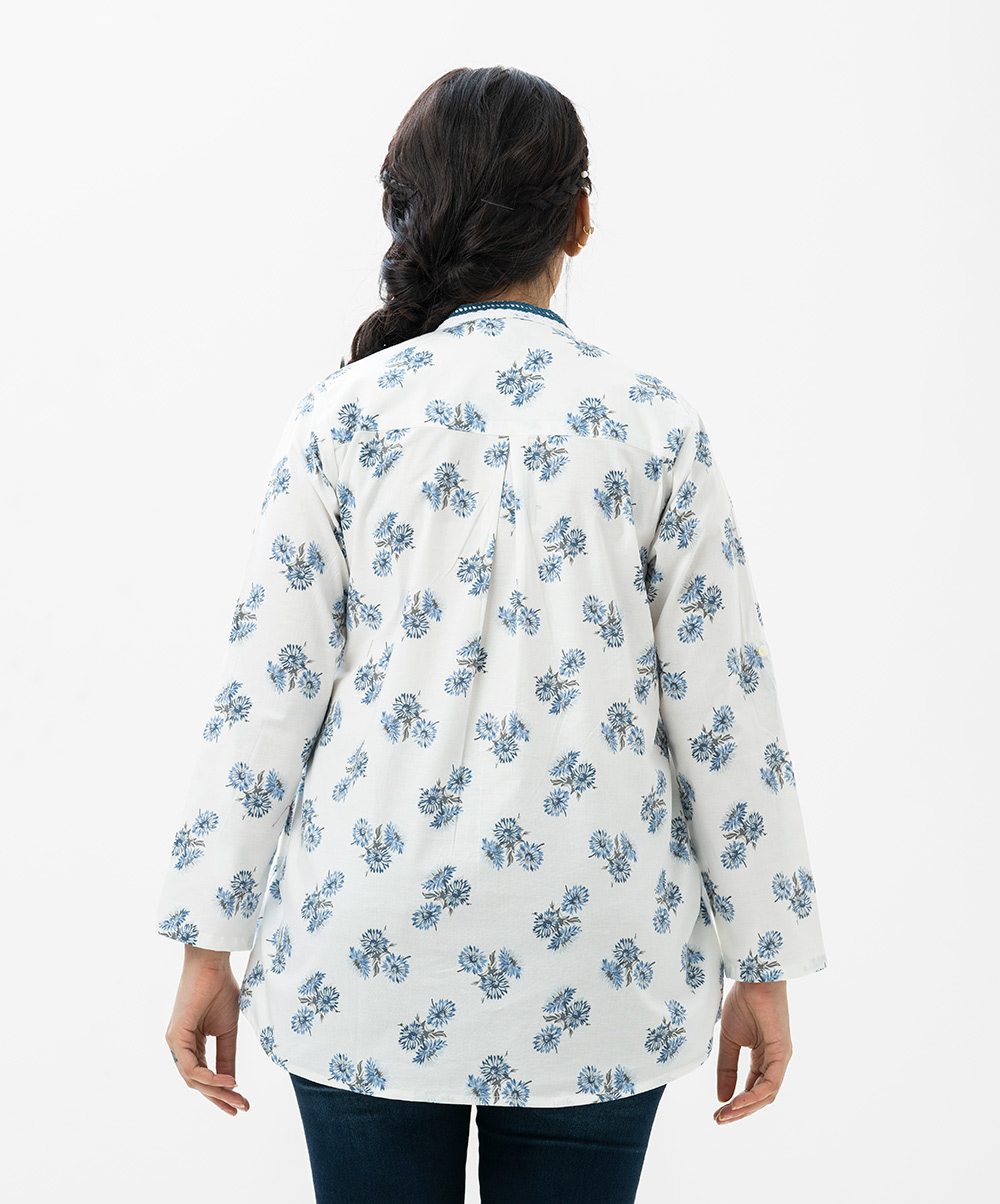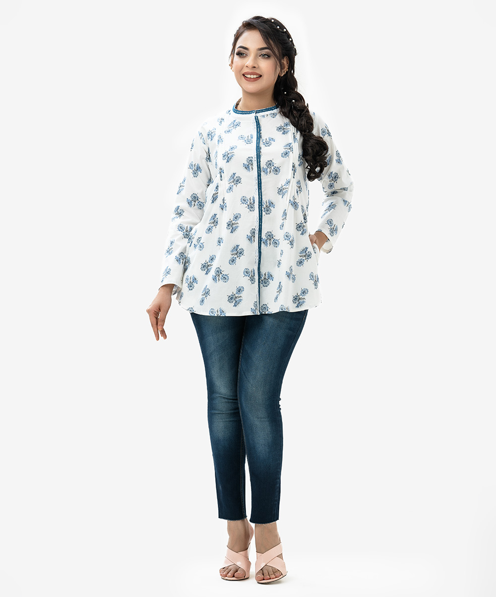 Women’s top in printed cotton fabric. Manderian collar, roll up sleeves and pin tuck at front.