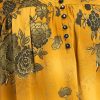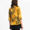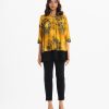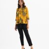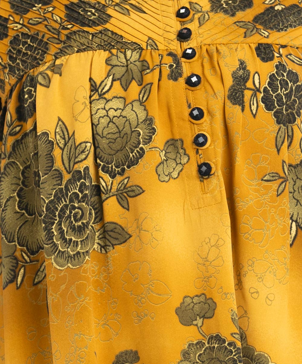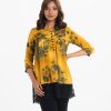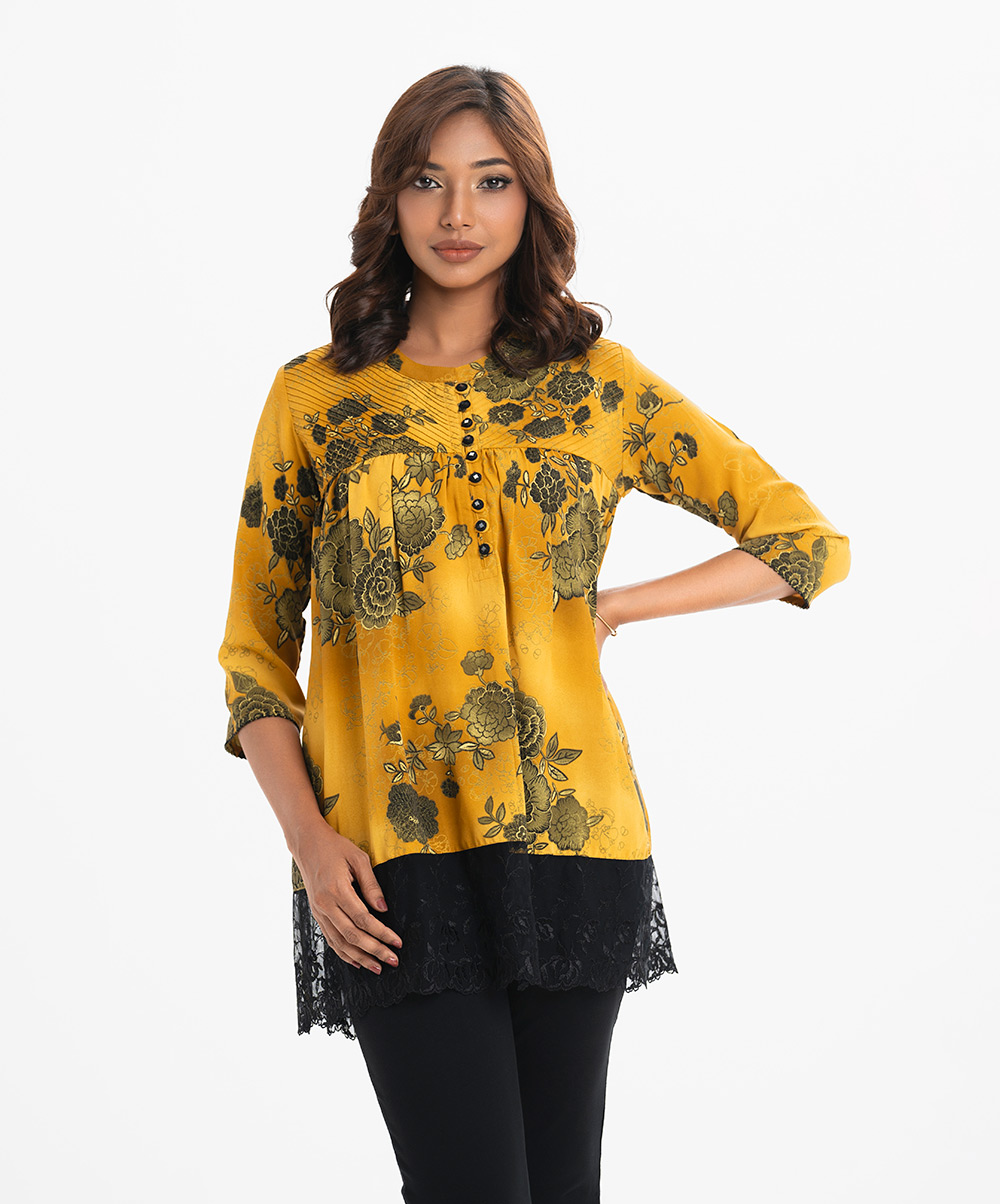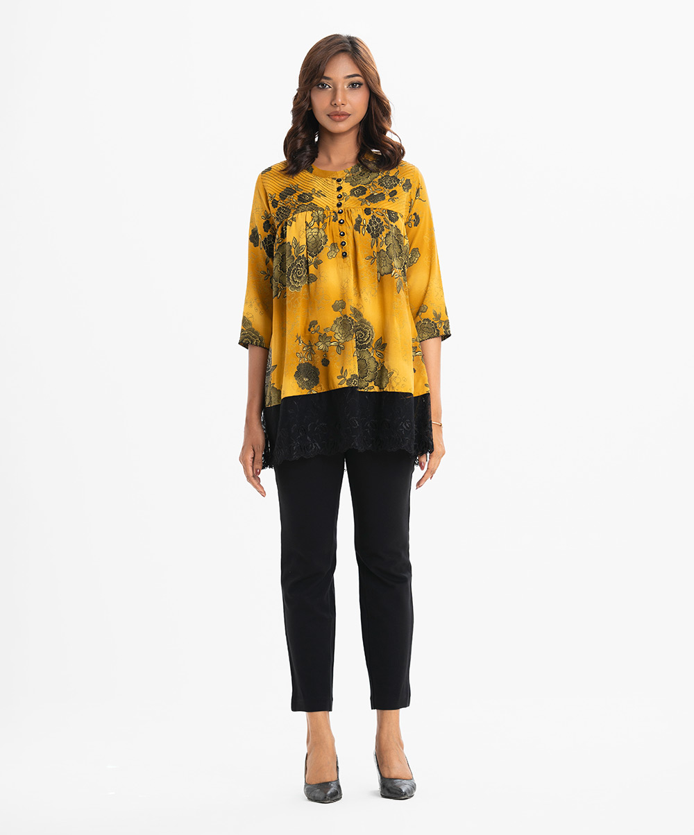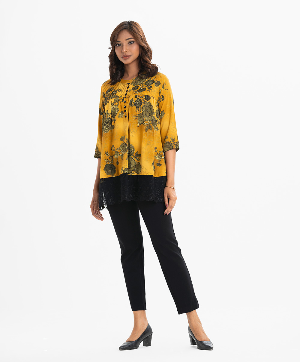 Women’s tent-style tops in printed georgette fabric. Stand collar, three-quarter sleeves. Pin tuck, mirror buttons at the front and lace attached at hem.