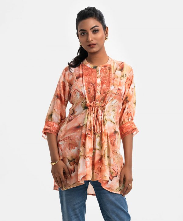 Women’s A-line tops in printed blended cotton fabric. Baby collar, bishop sleeves. Lace attached to the sleeves and front. Frill at front waistline with tie cord.