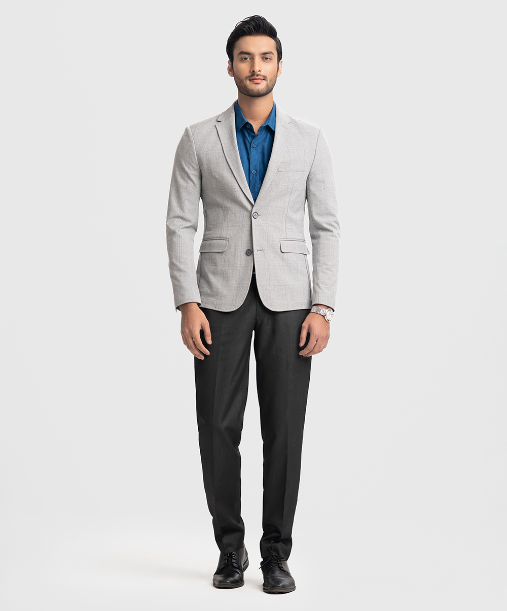 Single-breasted business casual blazer in soft check fabric with a stretchable silhouette. Notched lapels with a decorative buttonhole, two buttons at front, and decorative buttons at cuffs. Welt chest pocket, front pockets with flap with inner pockets. Lined.