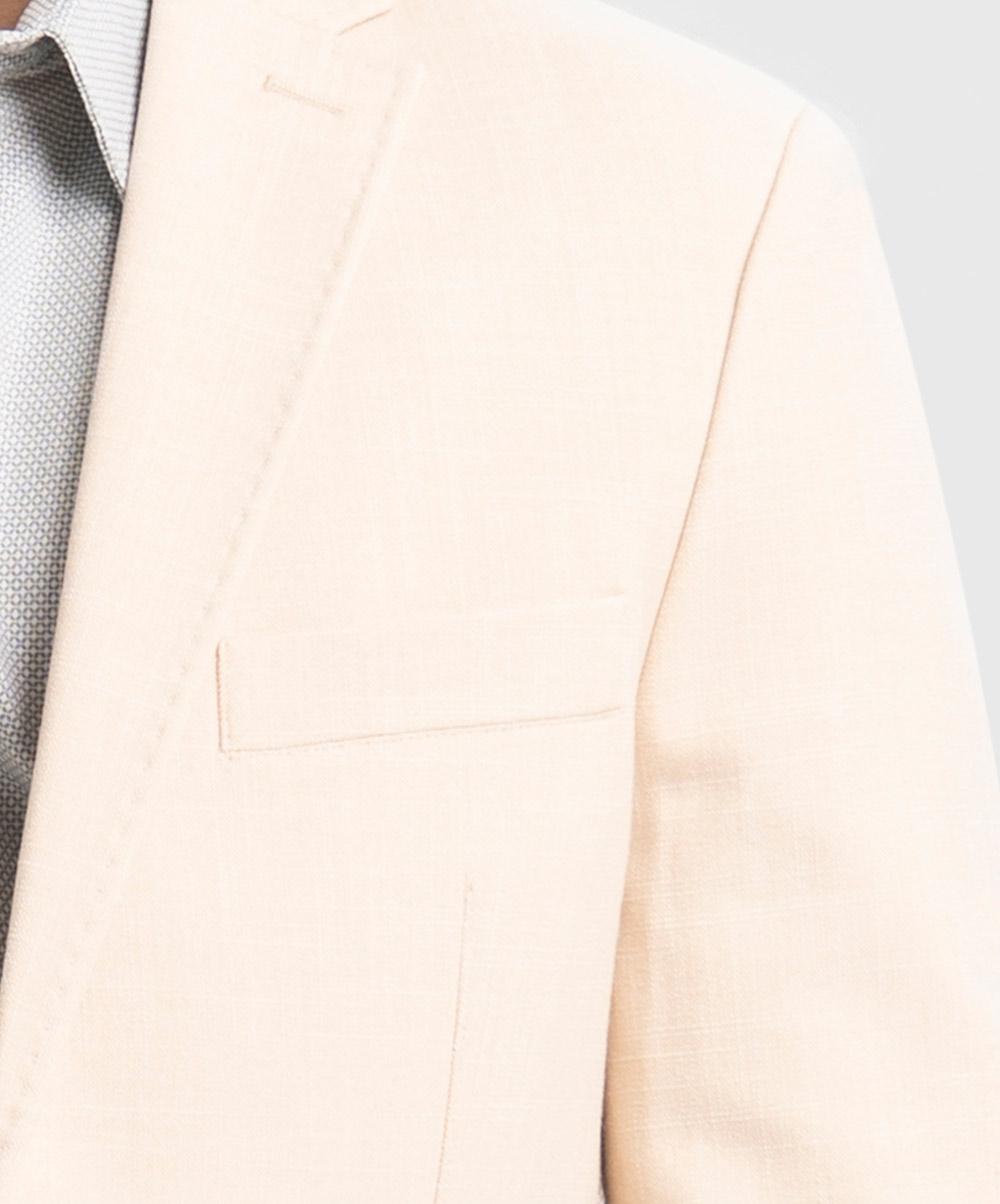 Single-breasted business casual blazer in soft, poly woven fabric with a stretchable silhouette. Notched lapels with a decorative buttonhole, two buttons at front, and decorative buttons at cuffs. Welt chest pocket, front pockets with flap with inner pockets. Lined.