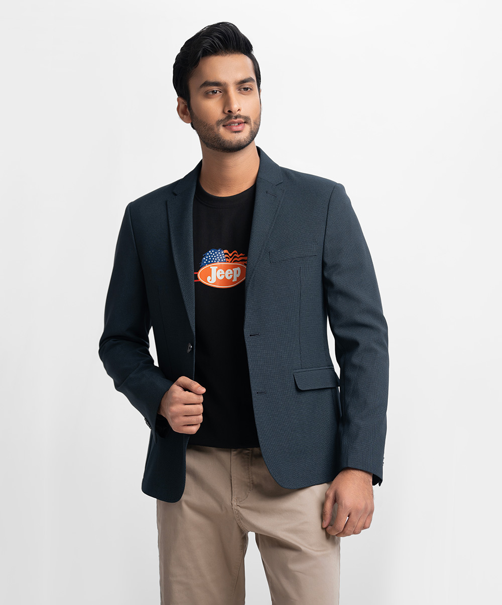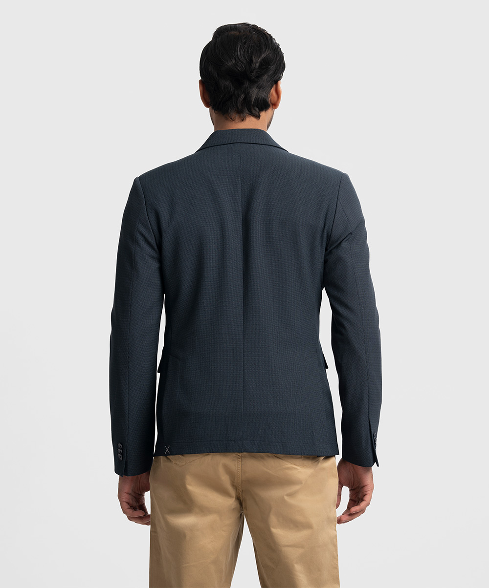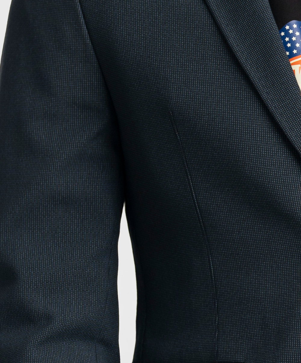 Slim-fit, single-breasted premium knit blazer in soft, woven fabric with a stretchable silhouette. Notched lapels with a decorative buttonhole, two buttons at front, and decorative buttons at cuffs. Welt chest pocket, front pockets with flap with inner pockets. Lined.