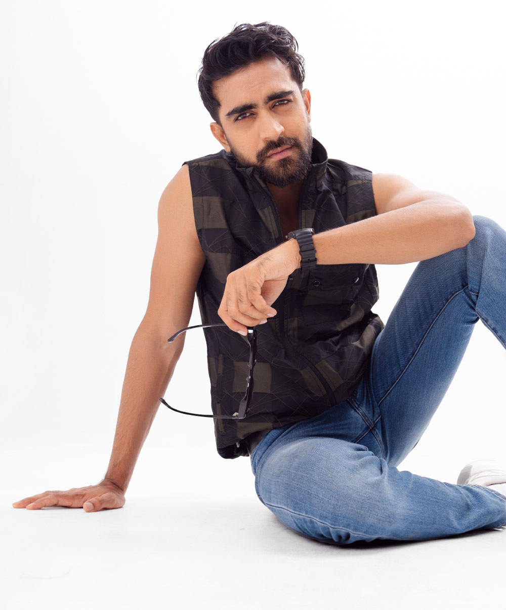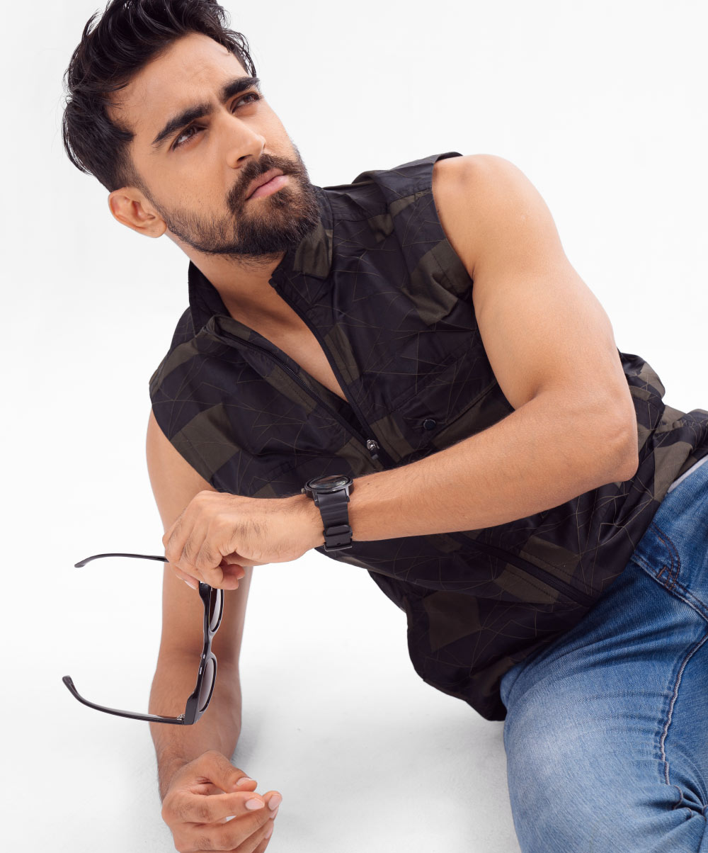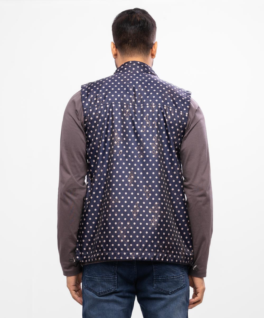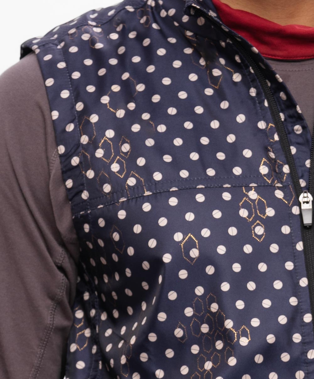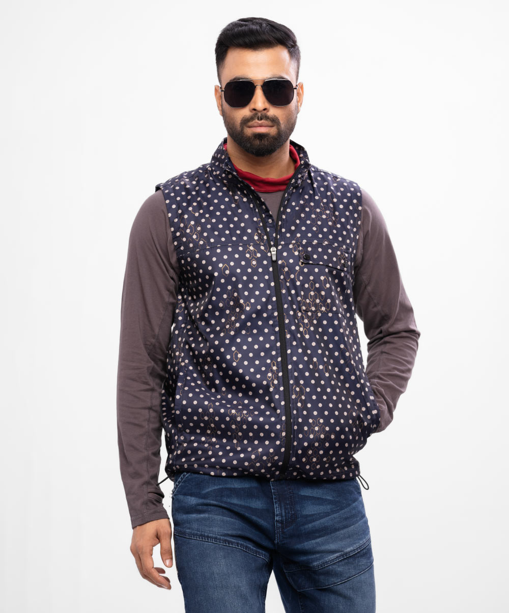 Sleeveless Jacket in printed Taffeta fabric. Features a Stand-up collar with zipper closure at the front, chest pocket with flap and hip pockets. Full lining in Taffeta fabric with double inner pockets.