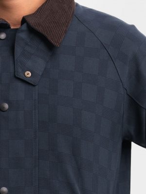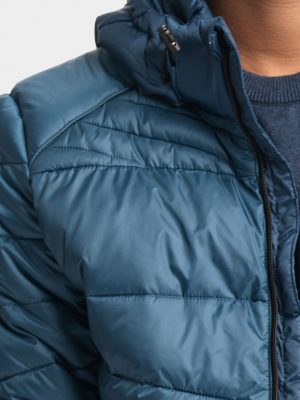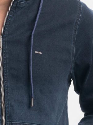 Men’s casual slim-fit denim jacket. Stand collar with a throat latch, full sleeves. Front zipper opening with two pockets.