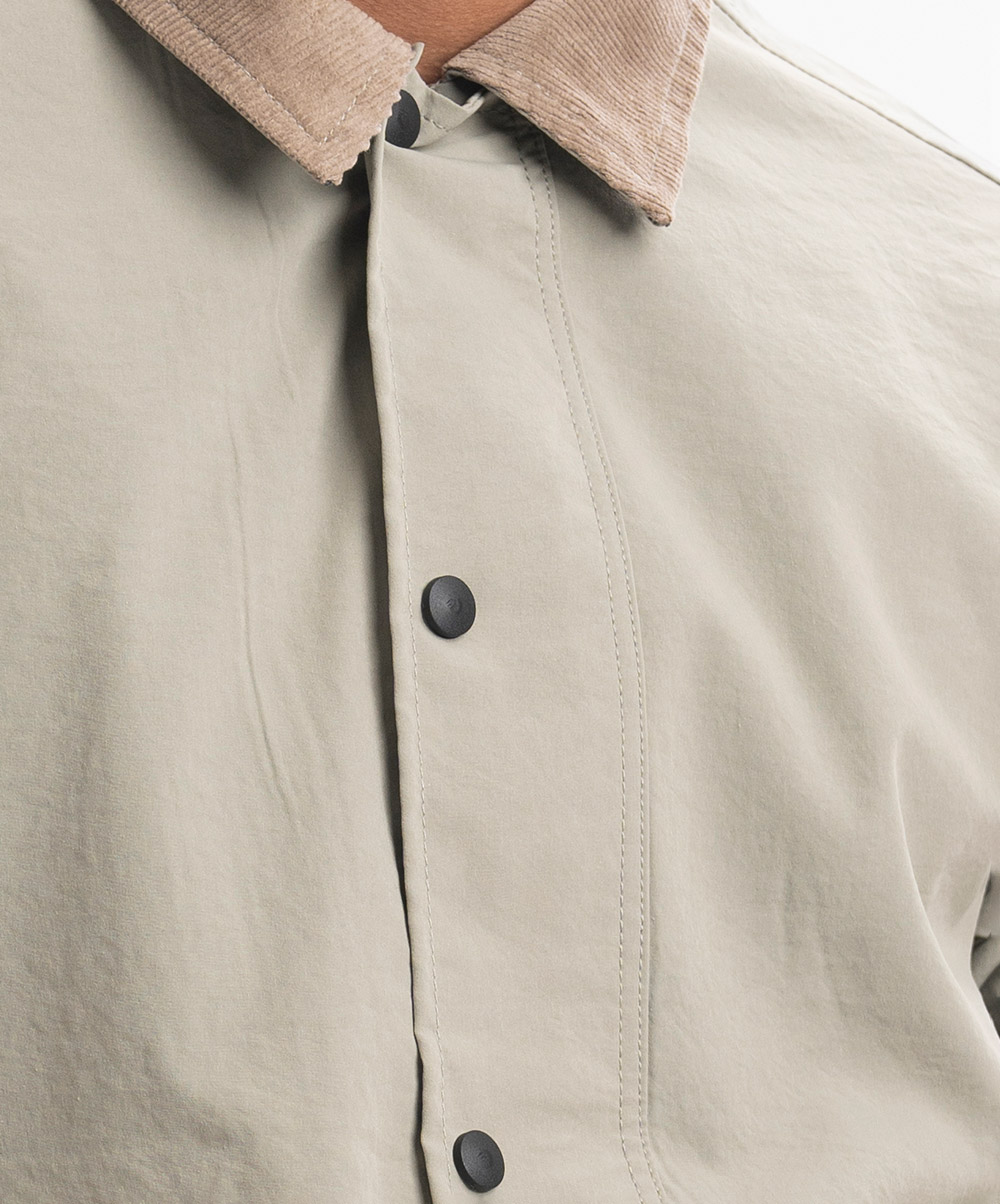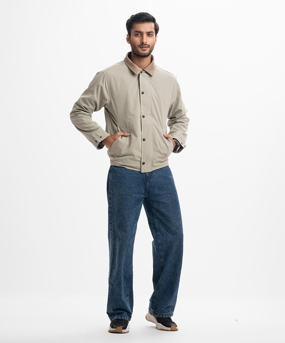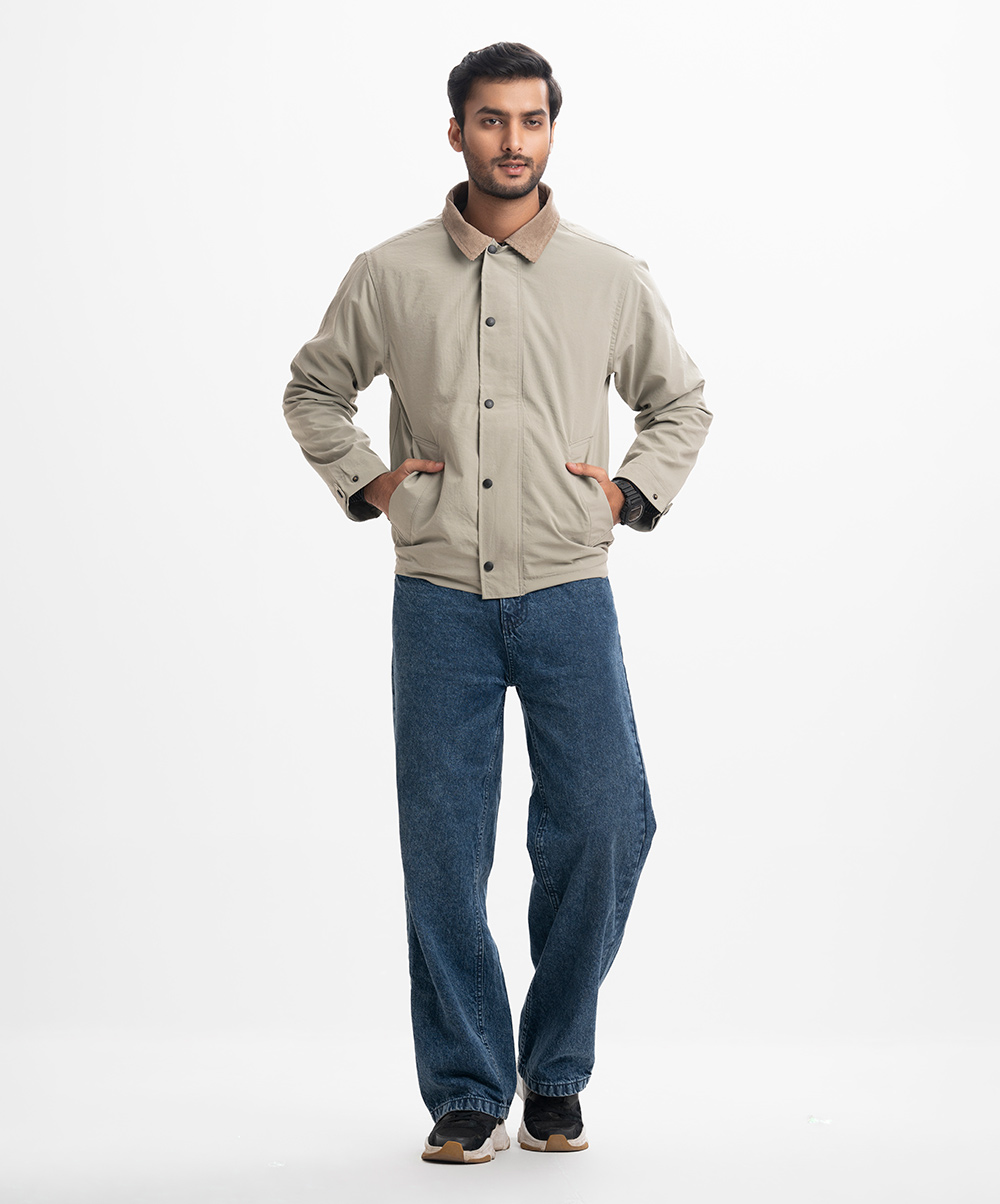 Men’s concealed buttoned casual jacket in blended fabric with taffeta lining. Corduroy collar, full sleeves, hidden zipper & side pockets.