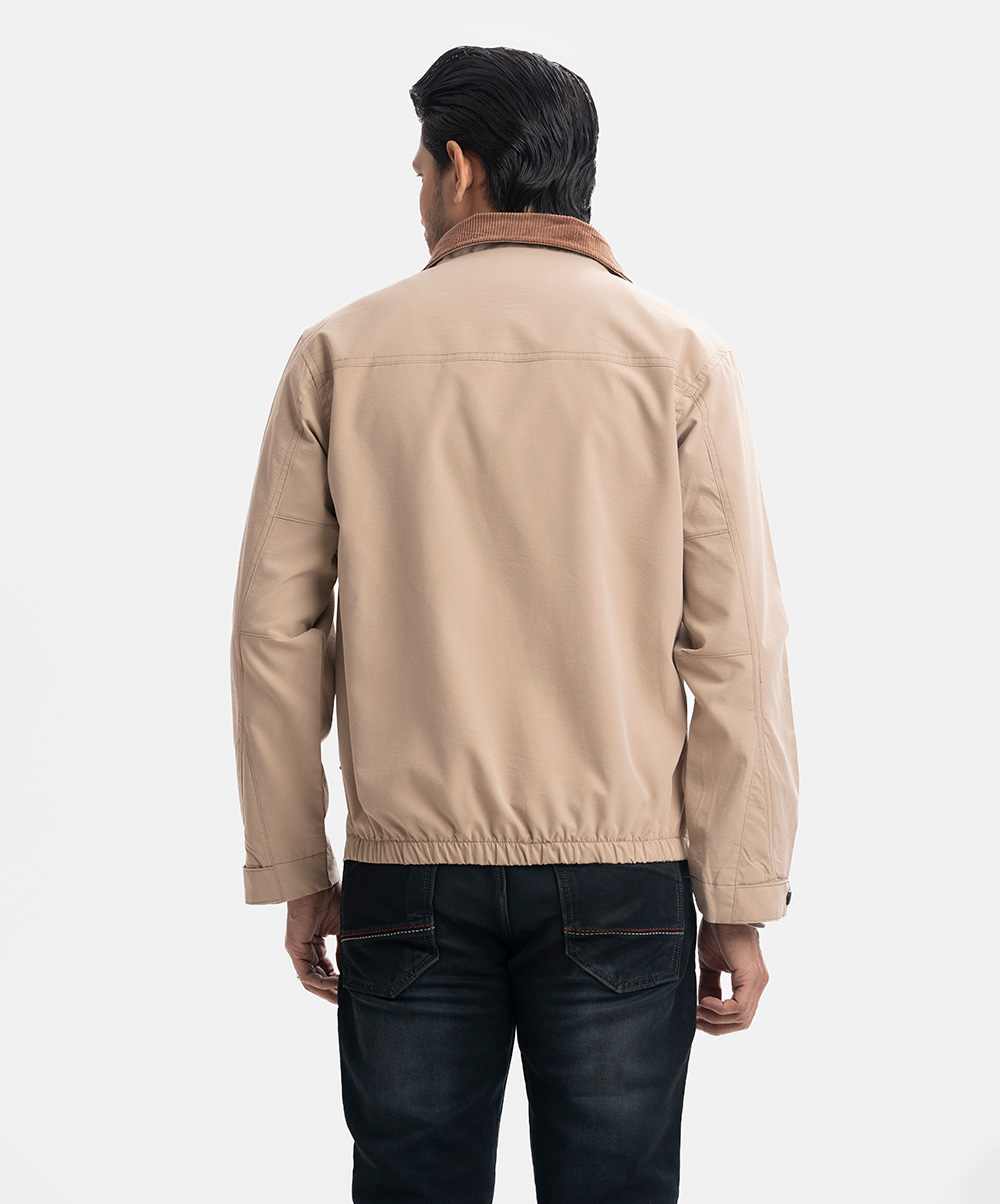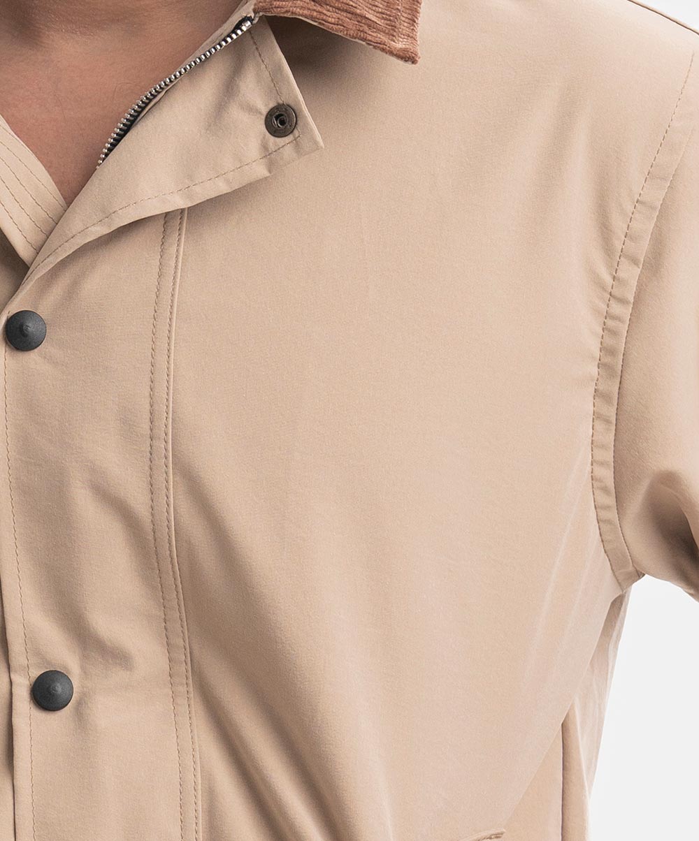 Men’s concealed buttoned casual jacket in blended fabric with taffeta lining. Corduroy collar, full sleeves, hidden zipper & side pockets.