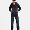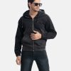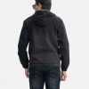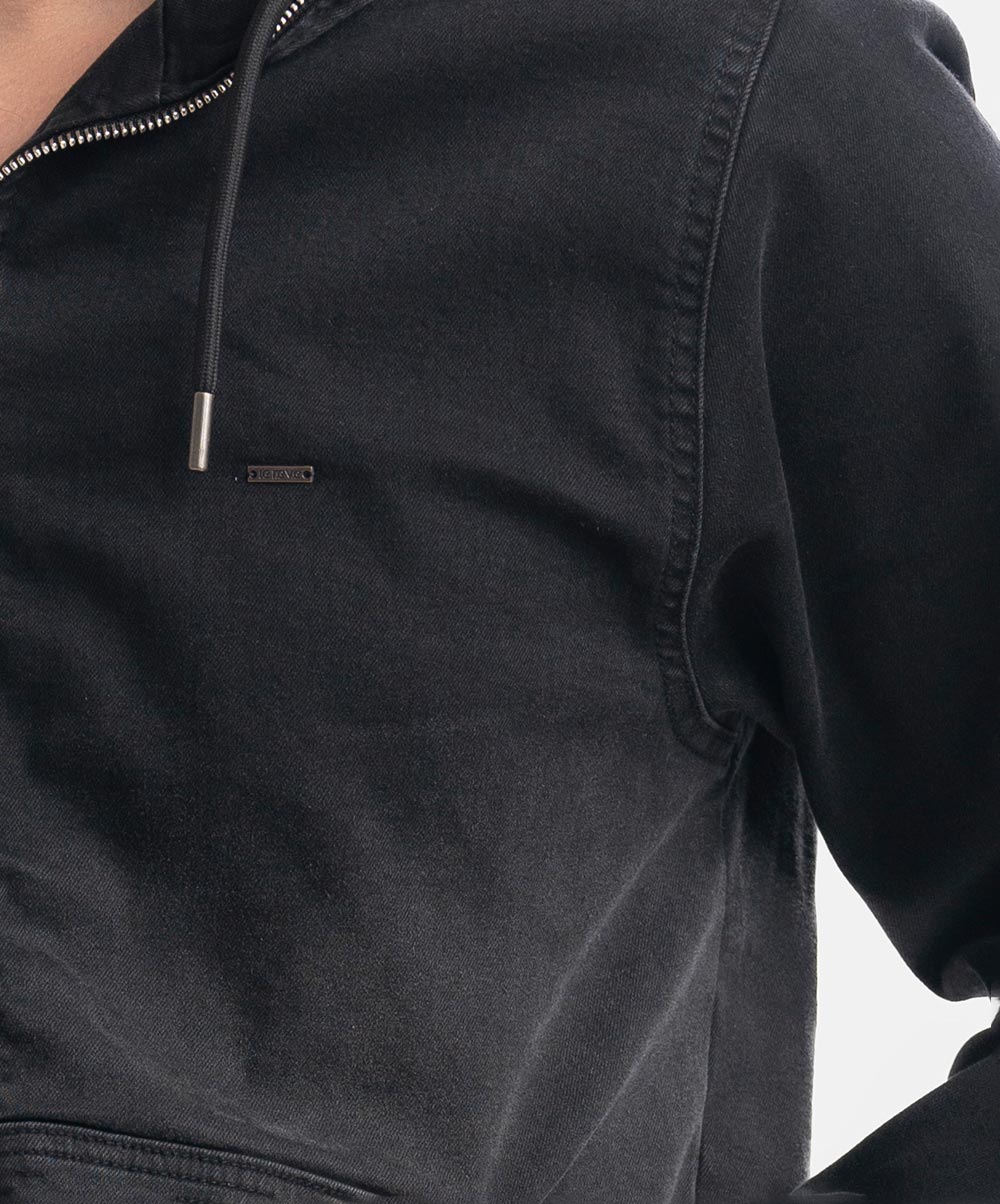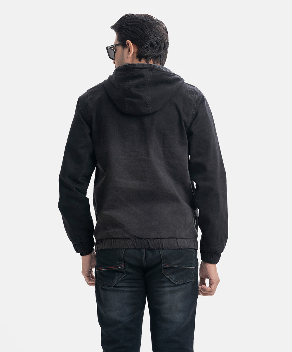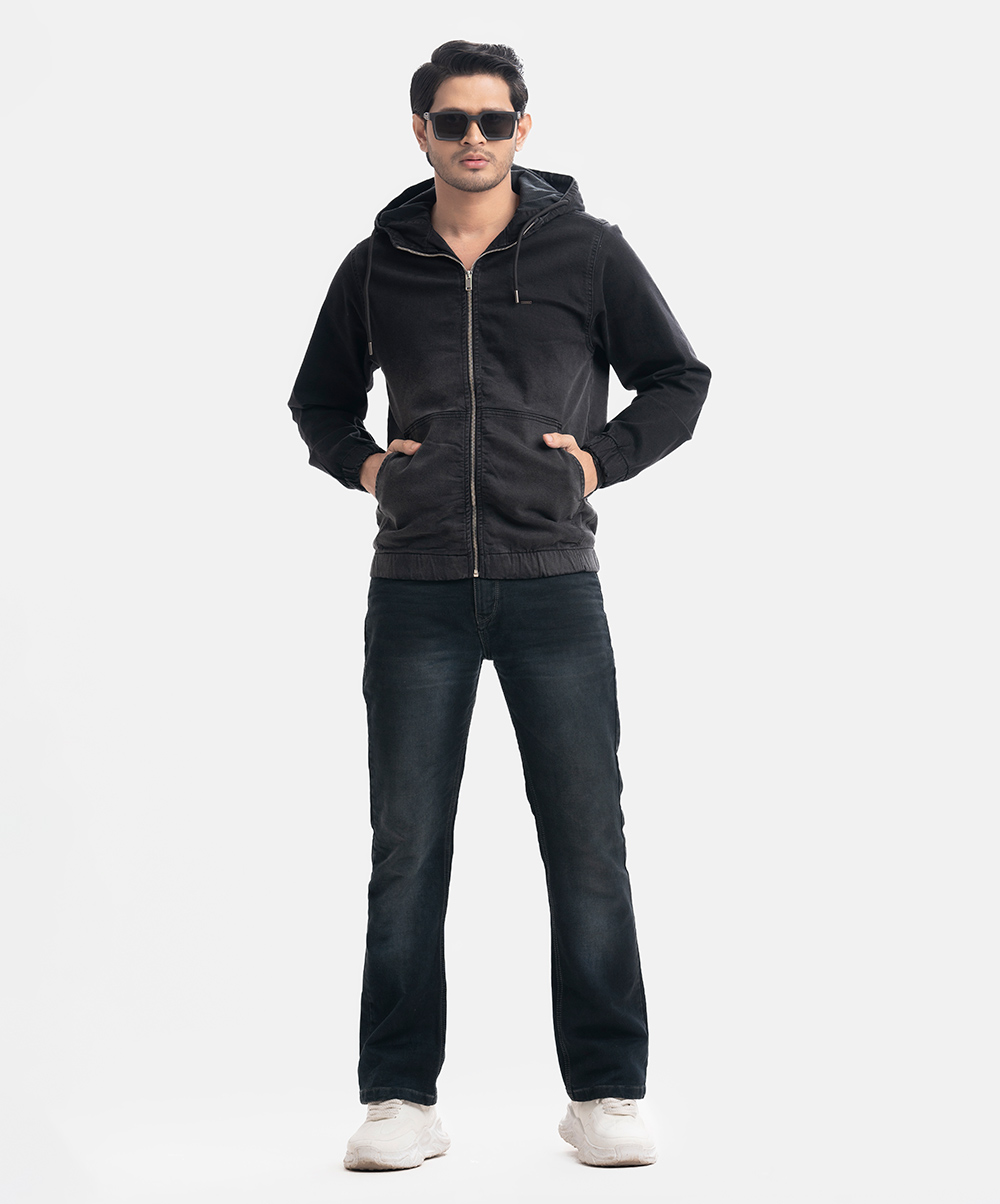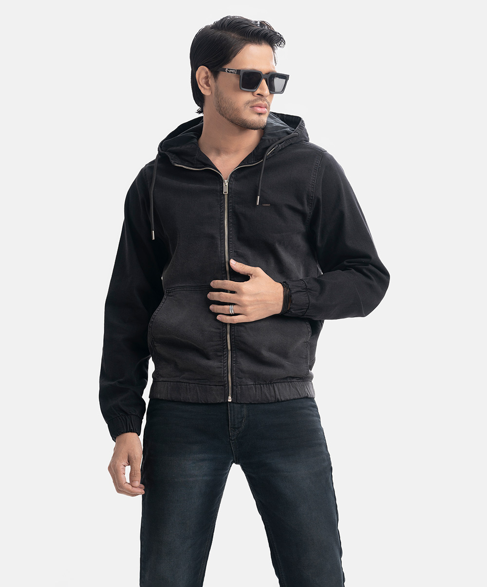 Men’s casual hooded jacket in denim fabric. Full sleeves, front zipper opening with two hand-warming pockets.