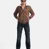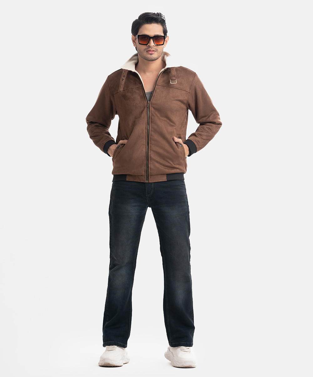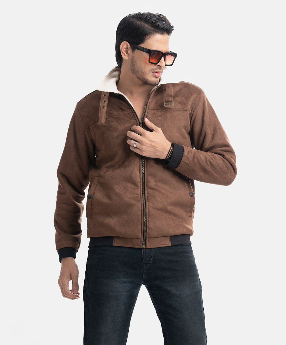 Men’s Zip-front casual jacket in suede fabric with fleece lining. Buckle detail strap collar, full sleeves, side pockets with button. Ribbed sleeves cuff & hemline.