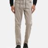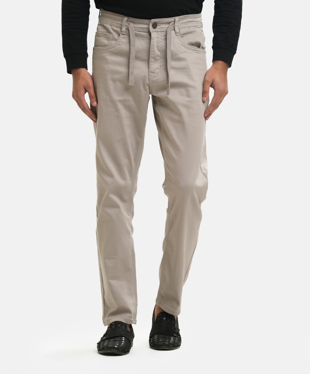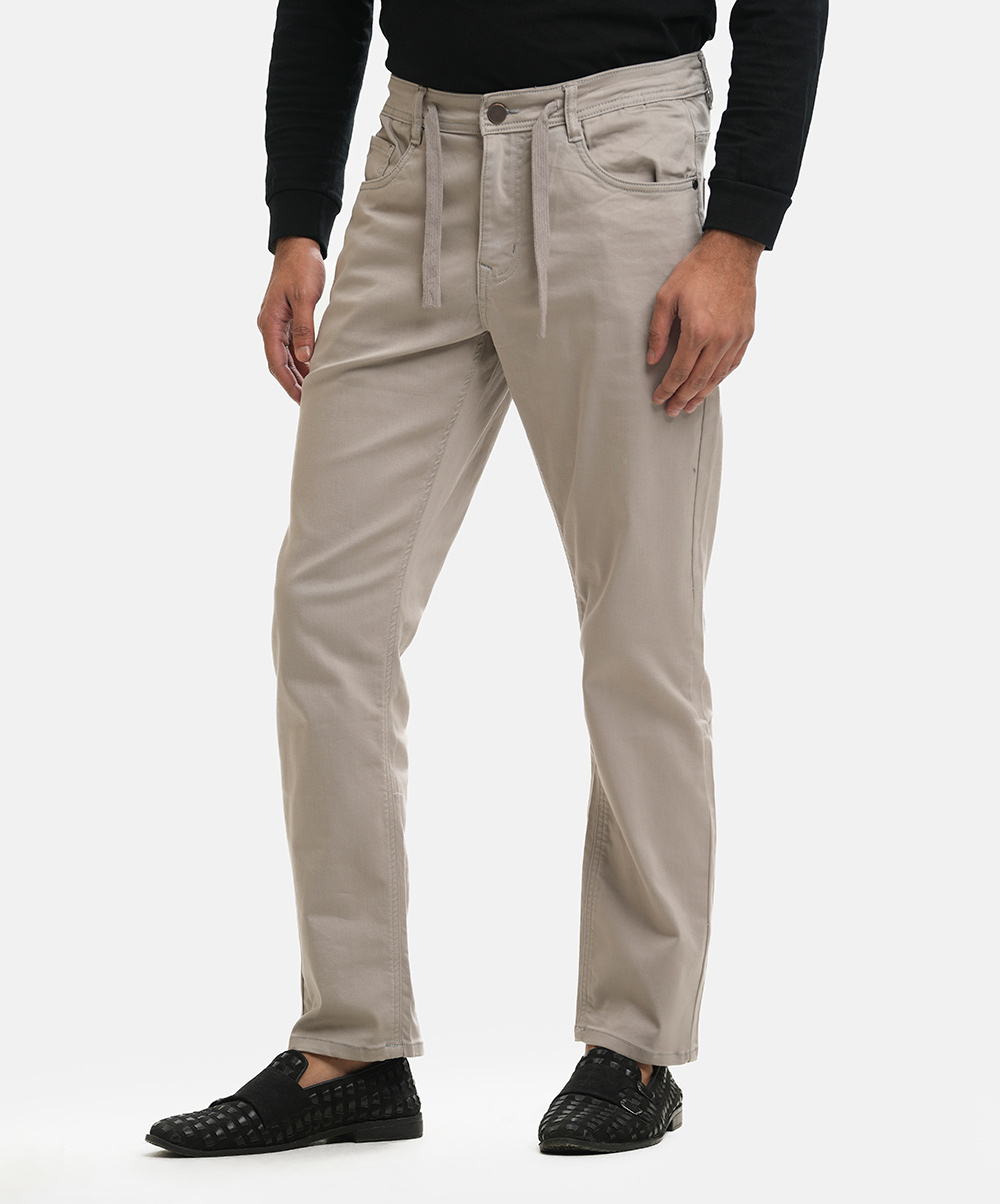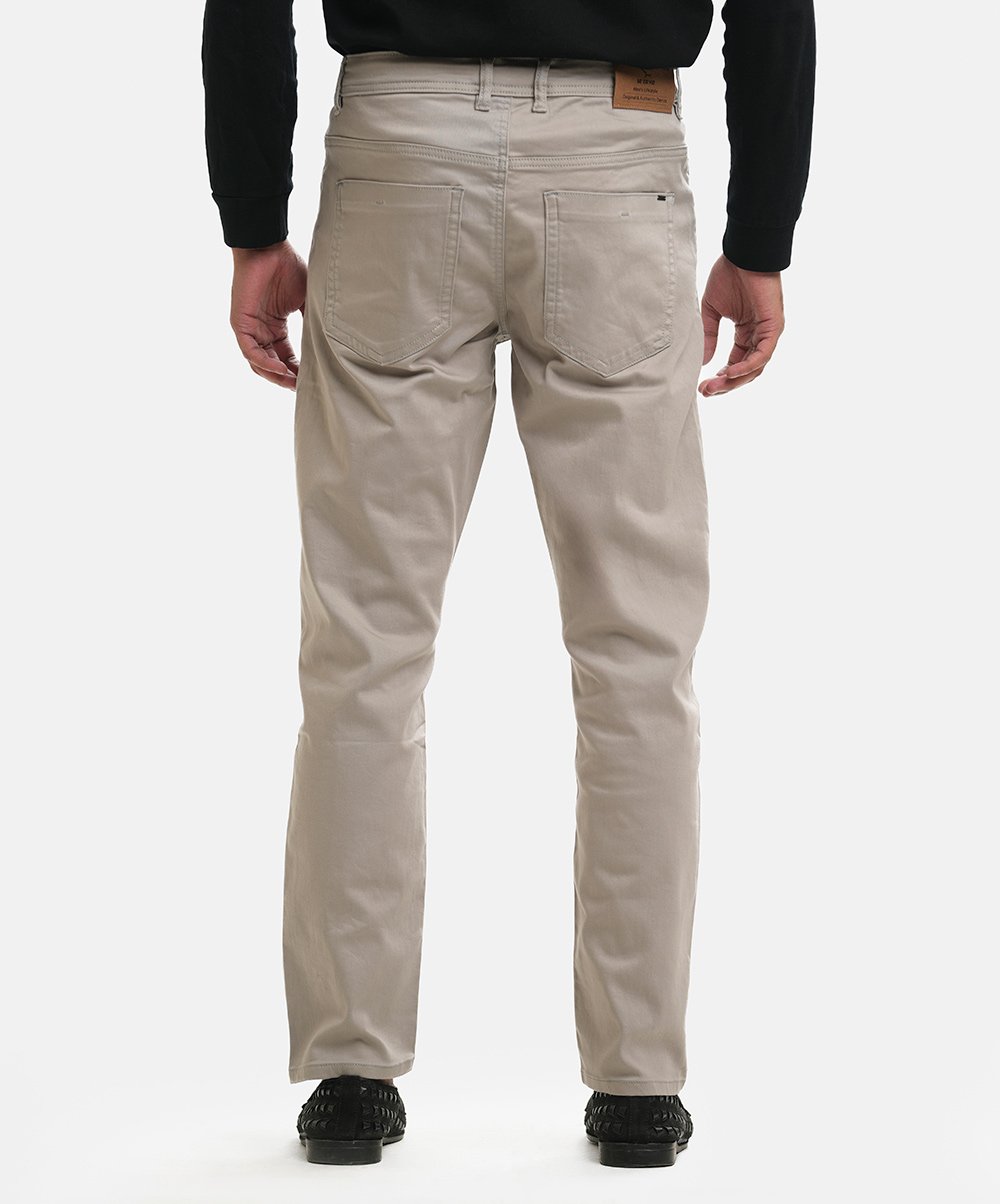 Men’s regular fitted pant in cotton blended denim fabric. Five pockets, button fastening on the front and zipper fly.