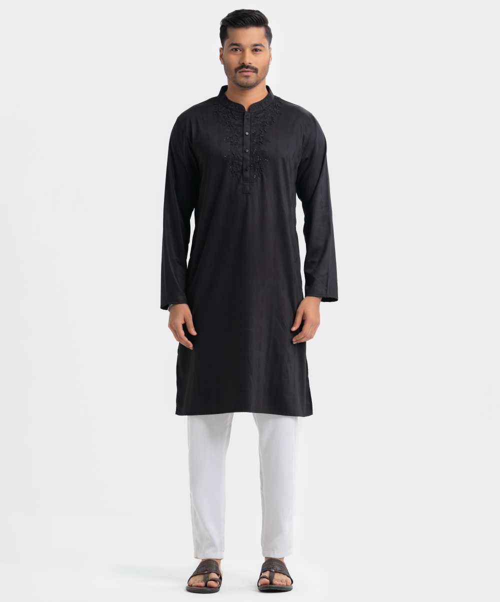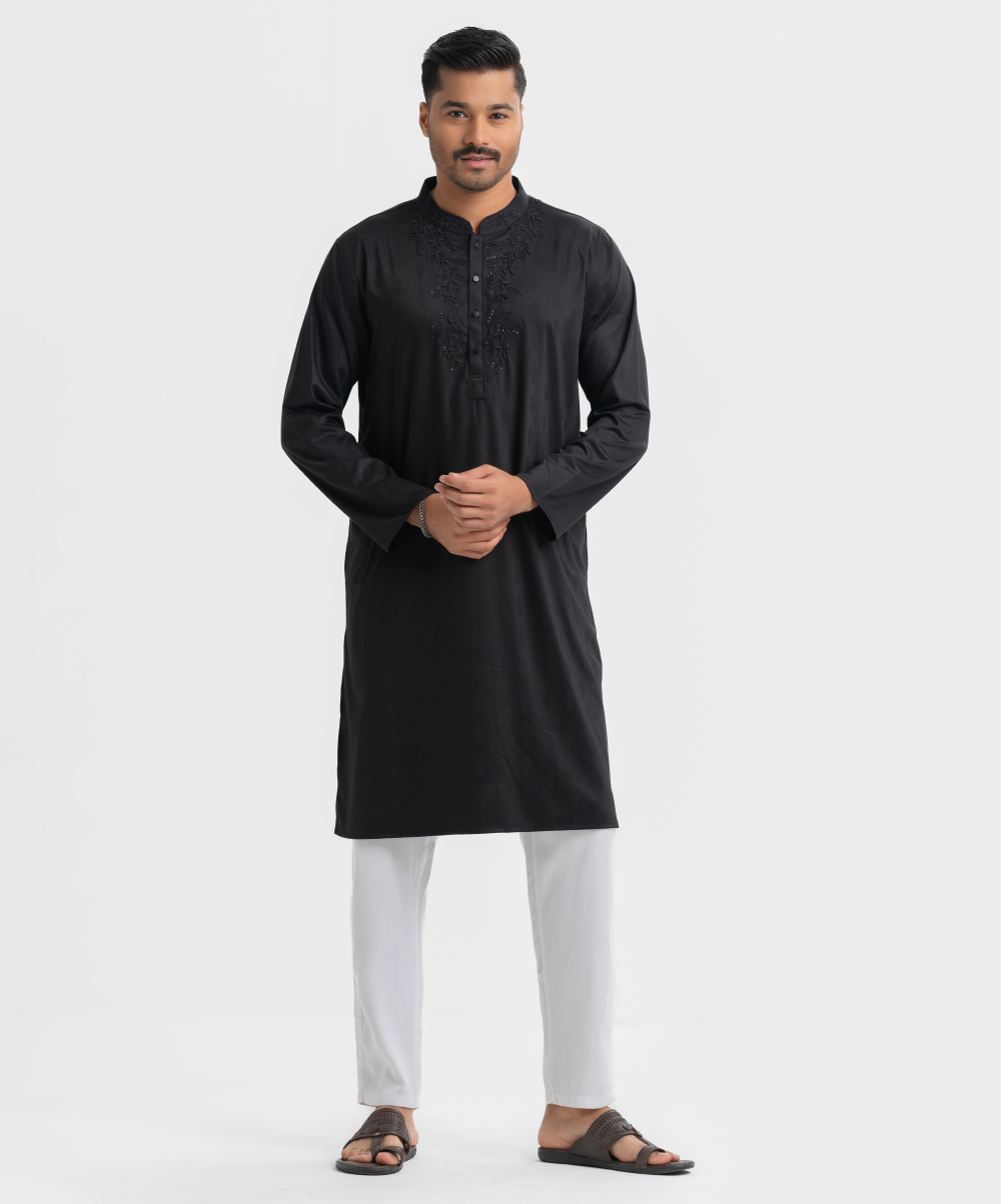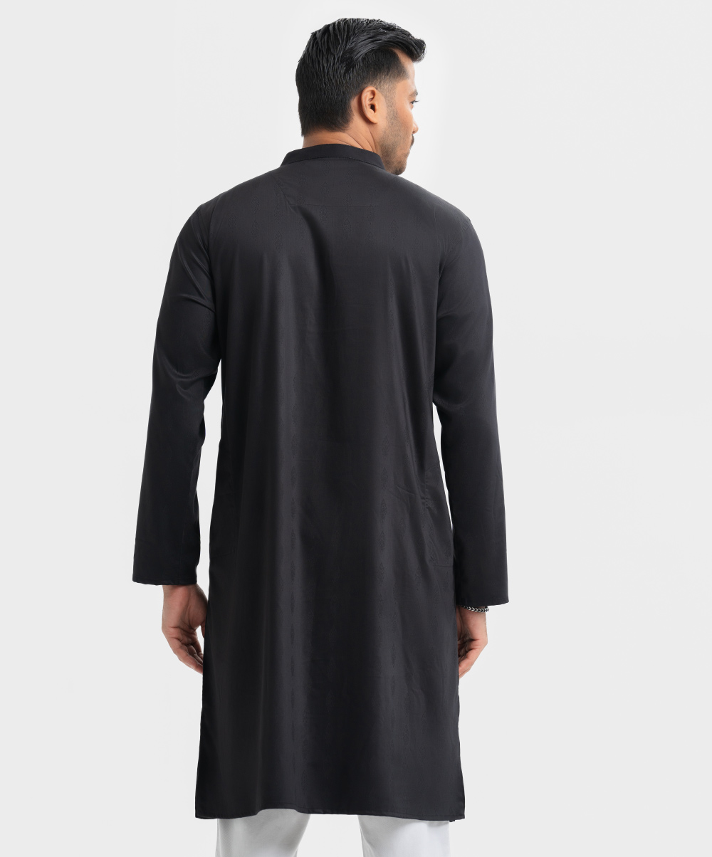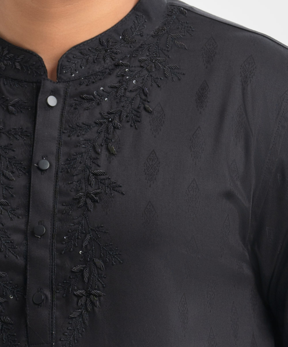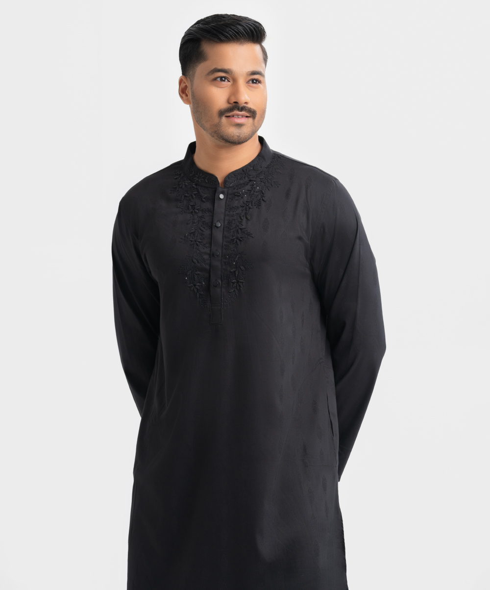 Men’s premium panjabi in jacquard fabric. Mandarin collar with metal buttons placket, full sleeves. Karchupi at front.
