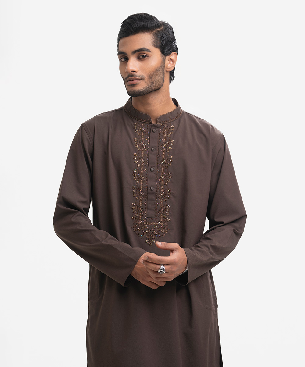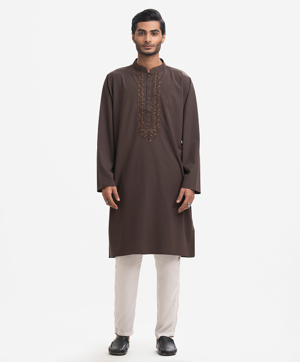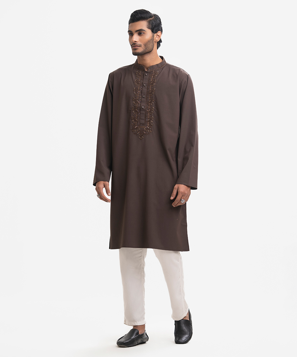 Men’s premium panjabi in cotton jacquard fabric. Long sleeves, inseam side pockets. Karchupi on the collar and placket.