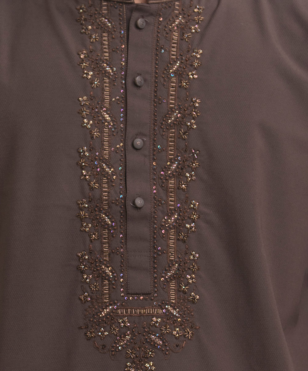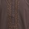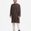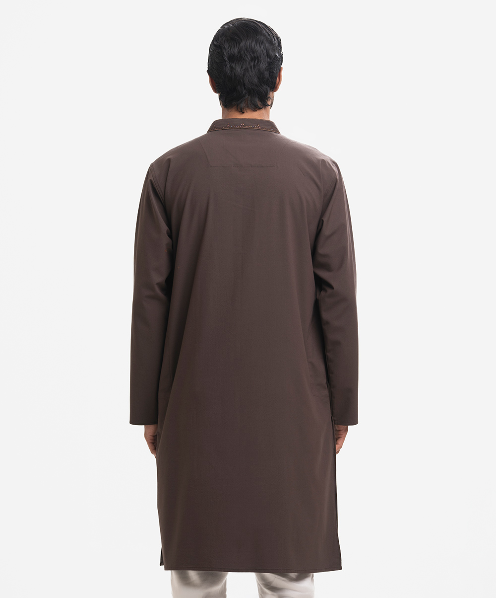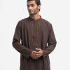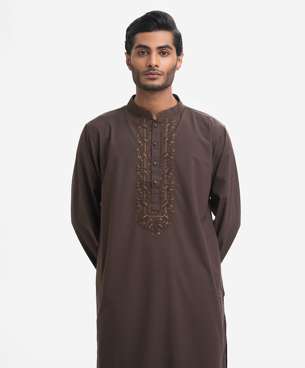 Men’s premium panjabi in cotton jacquard fabric. Long sleeves, inseam side pockets. Karchupi on the collar and placket.