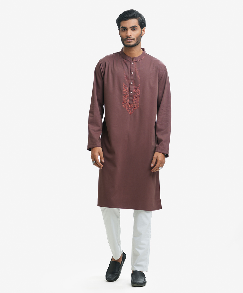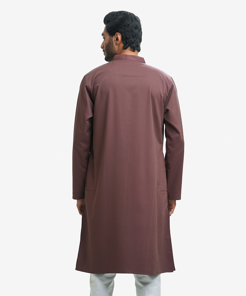 Premium panjabi in cotton jacquard fabric. Handstitch details at the collar and yoke. Long sleeves, inseam side pockets.