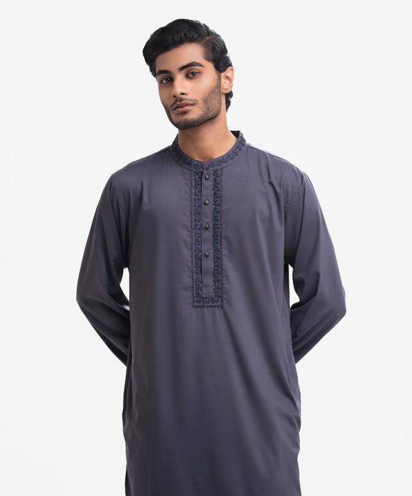 Exclusive panjabi in premium blended fabric. Karchupi at the collar and placket.